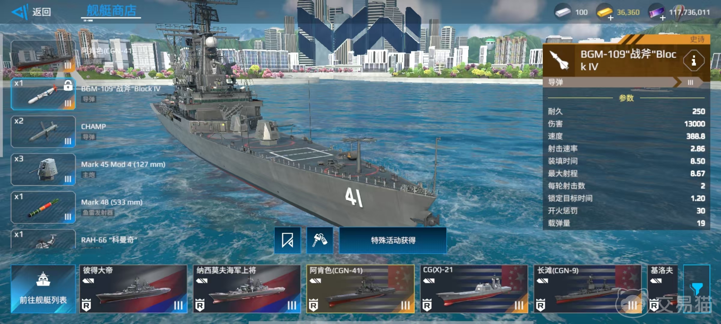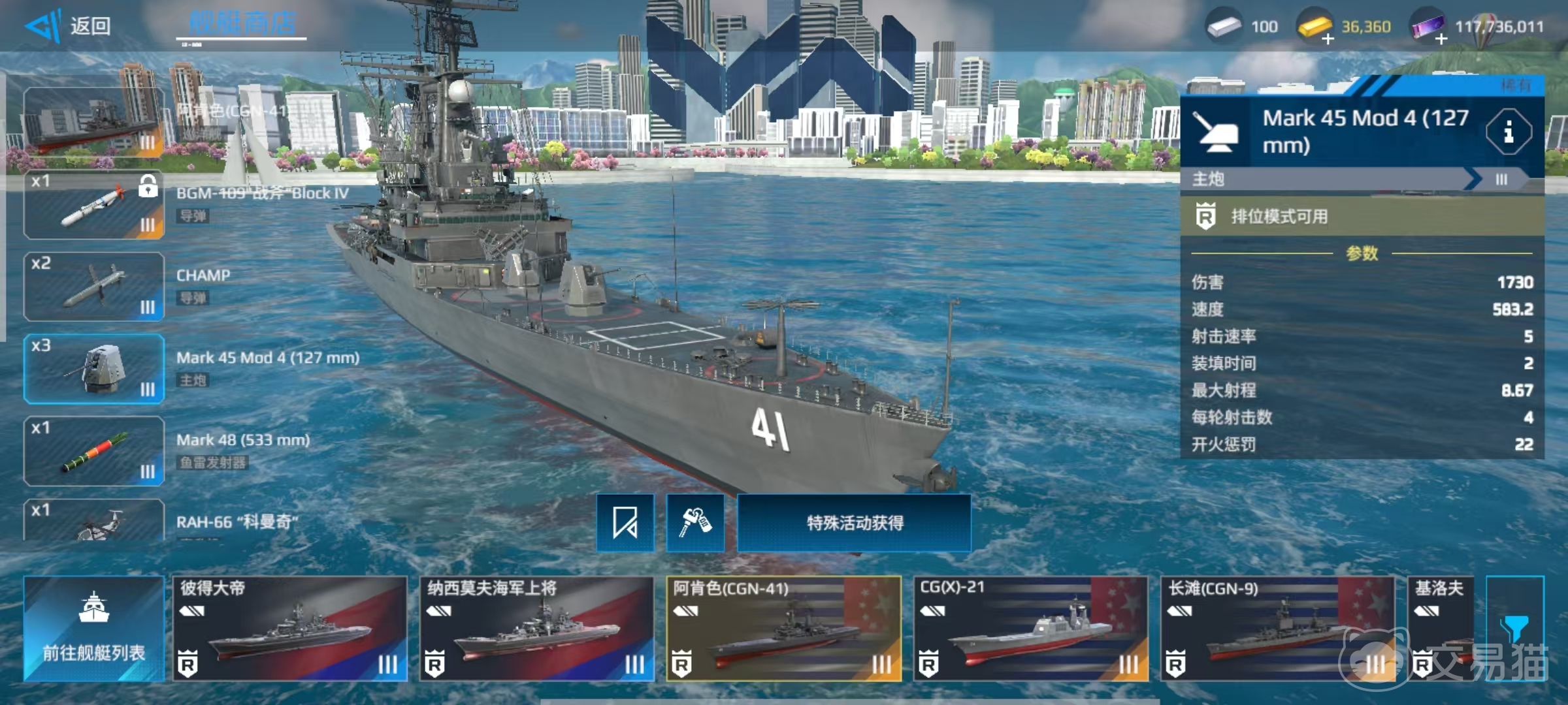 修理包能够恢复20%耐久,干扰弹可以使敌方常规导弹失去目标,弹药储备能够直接补充20%弹药,电子对抗能降低制导武器15%伤害。在装备方面,携带了三枚导弹,三门主炮,一具鱼雷发射器,一架直升机,二架对空武器和六架自动炮。值得一提的是,它有着两款锁定武器,分别是史诗品质的BGM-109战斧导弹和史诗品质的mk38自动炮。这款自动炮的伤害和速度都非常出色,所以在防空方面有着不错的表现。