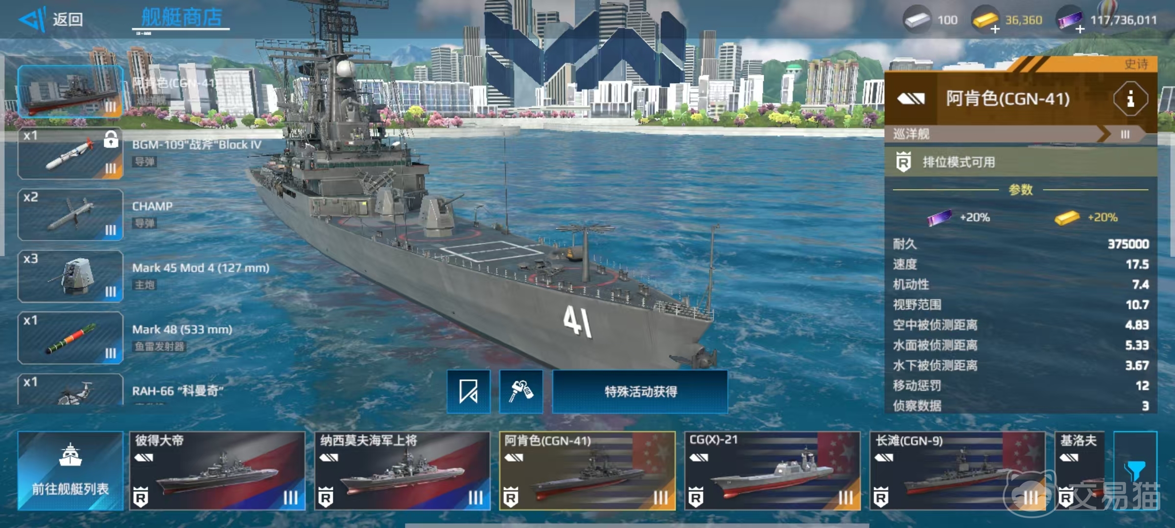 阿肯色巡洋舰是一艘需要通过特殊活动才能获取到的舰船,并非常规的金条船,这就使得在获取方面有一定的难度,当然也能够在战斗中获得更多的货币奖励。在自身常规属性方面,耐久为375000,速度17.5节,机动性7.4,视野范围10.7,空中被侦测距离4.83,水面被侦测距离5.33,水下被侦测距离3.67。消耗品方面,可以携带修理包、干扰弹、弹药储备和电子对抗。