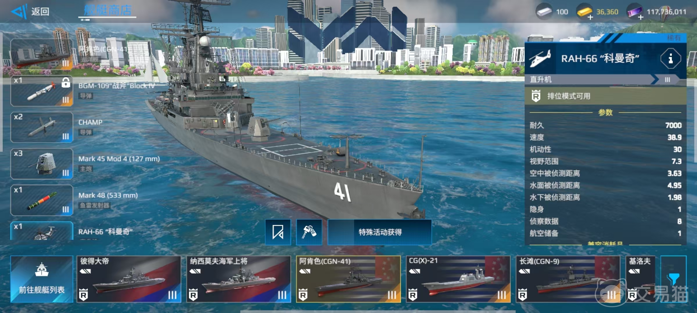 锁定的战斧导弹更是有着高达13000的伤害,再配合上另外的两个导弹槽,搭配得当后,一轮导弹输出就可以打出恐怖输出,让对方直接残废。自身主炮,初始携带主炮口径只有127毫米,伤害1730,主炮方面是比较拉垮,不过可以进行更换,通过更换更大口径的主炮,也是可以打出更高的输出。自身携带的直升机是科曼奇,这架直升机中规中矩,如果能够更换成更强势的直升机,属性还能进一步提升。