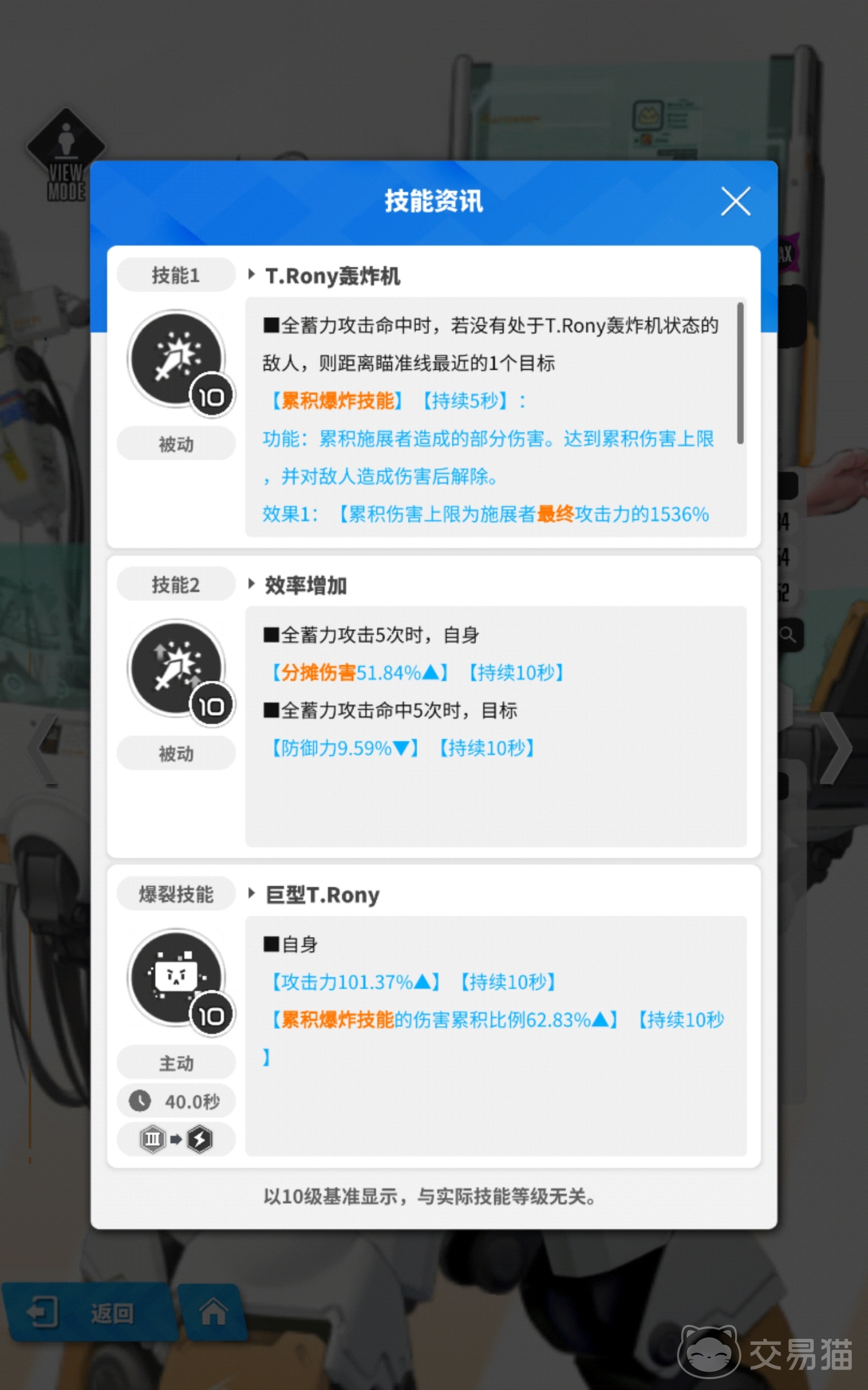 特罗尼的的普通攻击使用狙击步枪,蓄力后能造成高额单体伤害,同时为目标附加TRony轰炸机效果,每秒持续造成伤害。使用效率增加这招后,会对范围内所有敌人造成一定比例的分摊伤害。最后在放出巨型TRony,进一步升高自身的攻击力,同时还会增加累积爆炸伤害,这一机制让她在持续输出中兼具爆发能力,尤其适合应对血量较厚的精英敌人或需要快速清场的场景。手动操作时,建议优先锁定高威胁目标,通过精准蓄力快速叠加状态,最大化连锁爆炸的收益。