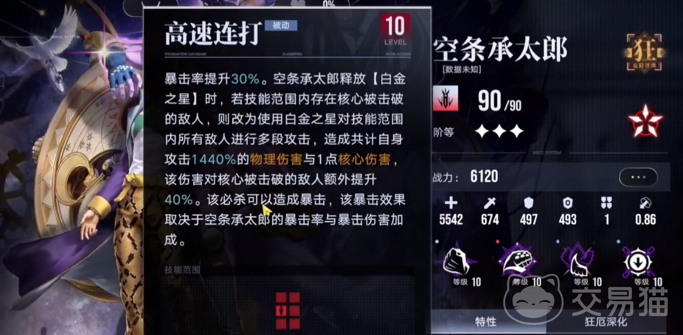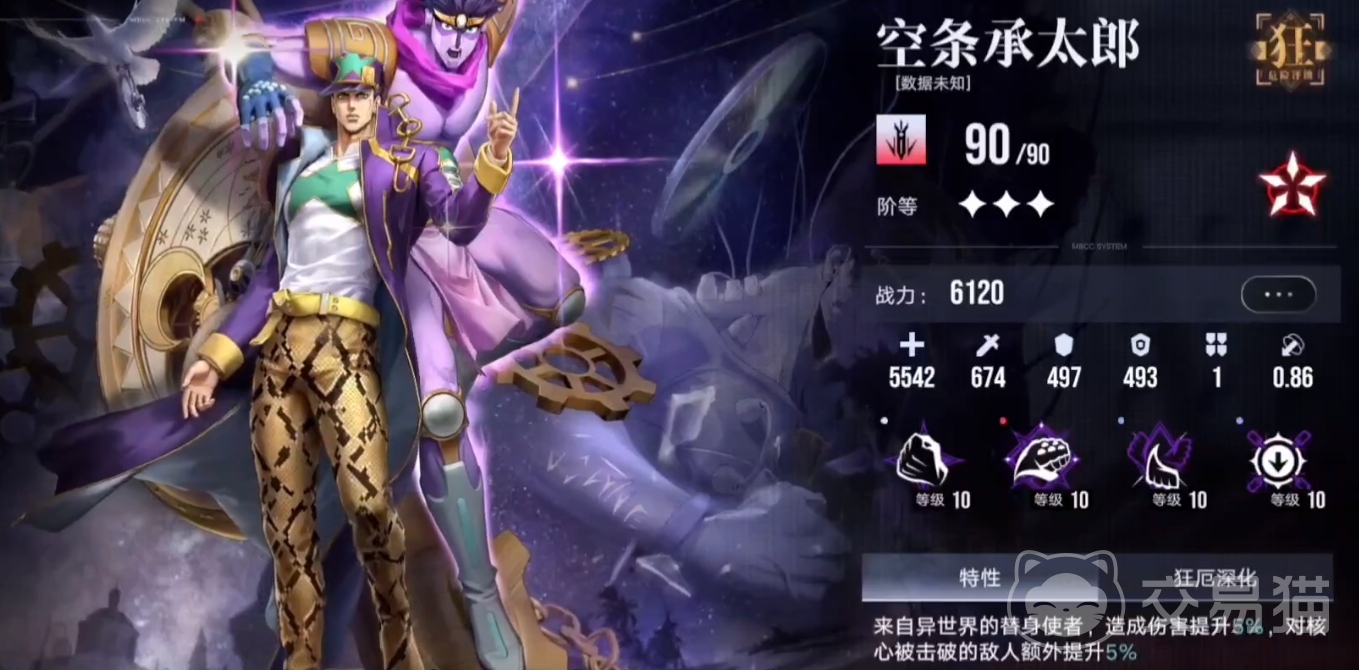 像空条承太郎也是非常不错的选择,作为速度与连招型的角色,是很多玩家进阶时候的首选,其白金之星时停技能可为大家去提供高机动性,普攻第3次可触发欧拉欧拉连招,爆发力非常的强,适合打BOSS或是PVP的对决。