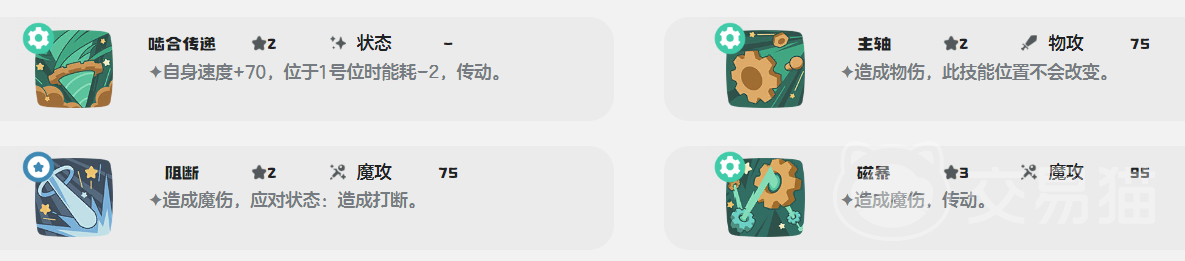 接着还可以佩戴啮合传递,自身速度+70,位于1号位时能耗-2,所以可以帮助你更快地发起进攻。然后主力输出技能需要佩戴主轴,可以造成高额物伤,不过无法更改位置。若是遇见物抗高的怪物,则可替代成为磁暴,有效造成高额的魔法伤害。