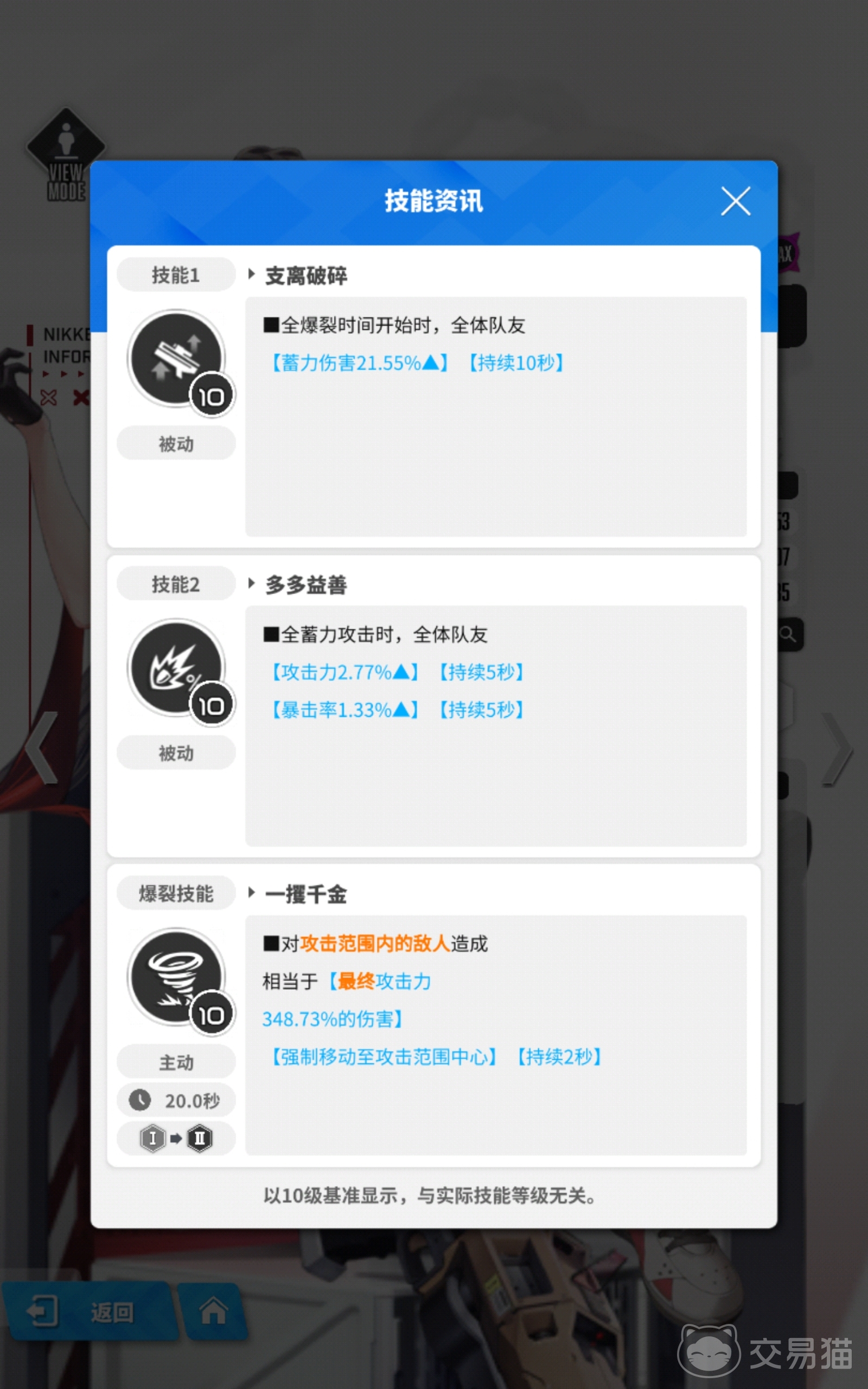 对于依赖蓄力输出的队伍,她可视为T1级辅助;若队伍以瞬发伤害为主,则优先级降低。在后续的培养中,建议优先提升发射器等级,强化增益效果,同时优先升级主动技能一掷千金与被动支离破碎,新手初期可将杨培养至同步器160级,后期根据关卡需求再进行适当提升。