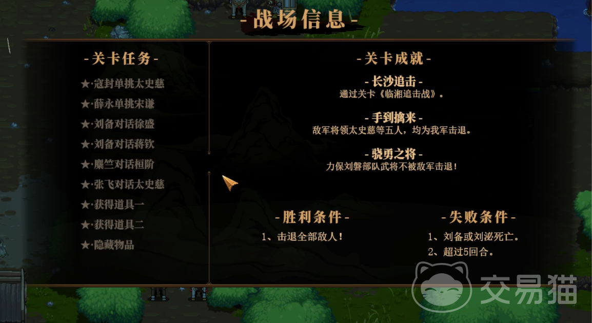 大家先来看一下获胜的条件吧,首要获胜条件便是击退所有对手,然后主要人物刘备、刘泌不能阵亡,并且回合数要控制在五个之内。所以要求还是颇为苛刻,另外还要保证刘磐部队不会被击退,最终才可解锁所有成就!