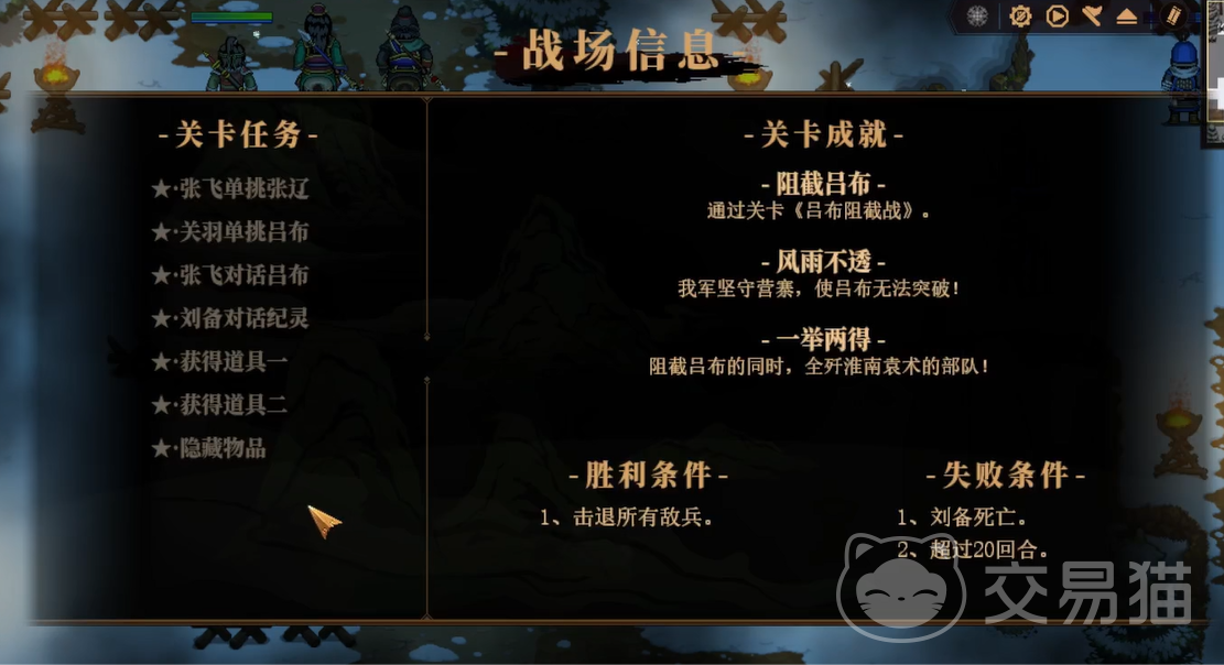 进入战场后,就会发现身处一片冰天雪地中,所以更能感受战争的残酷感。在这个关卡中,大家想获胜的话,就需要击退所有的敌人。然后还要保证刘备不阵亡,并且对局在20个回合之内结束才行,另外也要避免吕布突破过来。