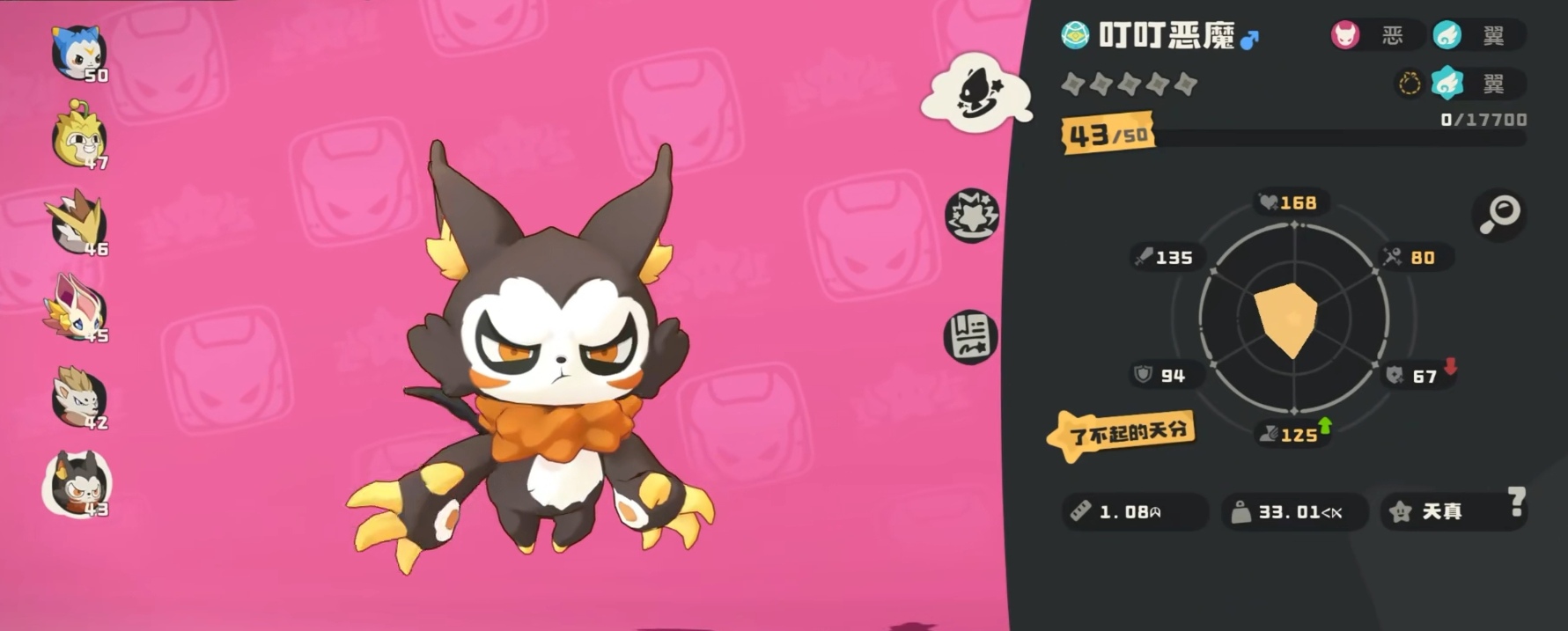 推荐一:叮叮恶魔,这是一只兼具了攻击力与速度的宠物,它的最终进化形态能够让自身的物理攻击属性得到极大提升,十分厉害。在战斗中,叮叮恶魔能够在造成伤害时按比例降低敌人攻击力,下次的攻击威力直接翻倍。其实玩家可以去利用它的优势,来实现叮叮恶魔的快速打击,从而造成多重伤害,不过由于叮叮恶魔的抗性较差,因此容错率有所降低,所以大家在培养它的时候要注重强化生命天赋,合理地分配技能、时刻注重能量回复才行。