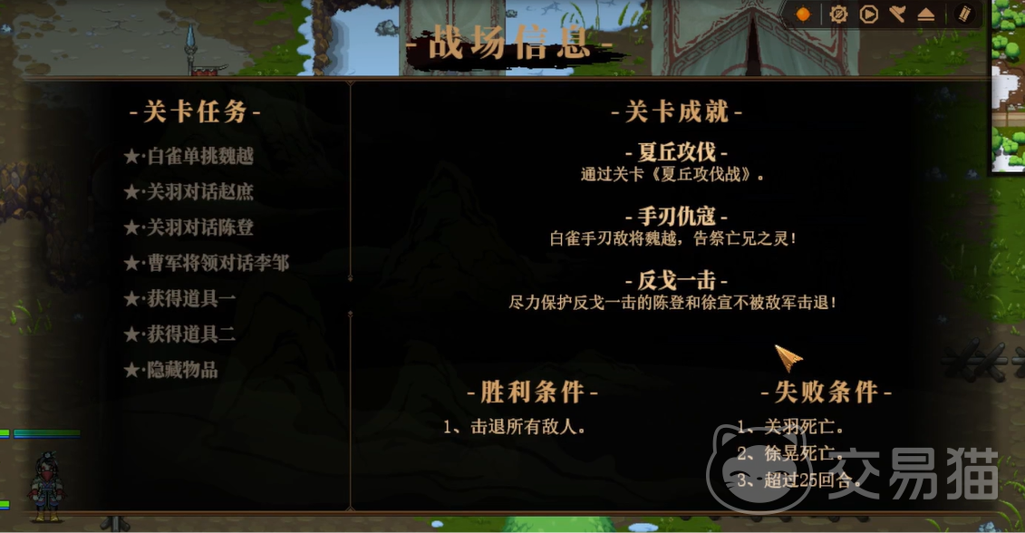 首先大家先来看看通关要求,只需要击退所有对手即可获胜,不过前提是徐晃和关羽不能阵亡,并且回合数不超过25。另外想要解锁相关成就,就要完成关卡任务,例如白雀击败魏越,即可获得成就奖励。