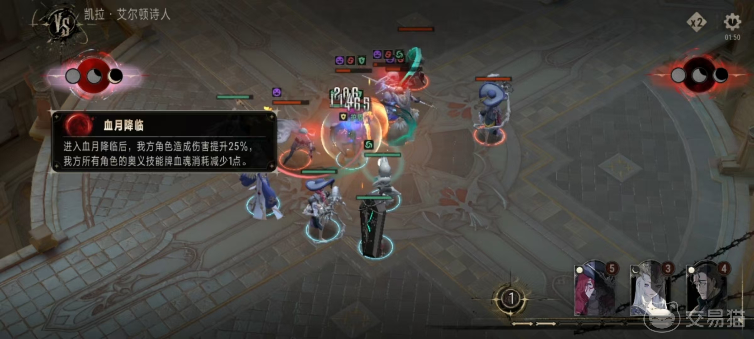 当进入战斗界面之后,就可以看到界面的左下角有三个月相的图标,每释放一个对应的技能就可以点亮一个,三个全部点亮之后,就进入到了血月爆发状态。所以大家要做的除了在前期阵容搭配的时候做好组合之外,在战斗中,也应该及时将这三类技能先释放出来,这样尽早的触发,对于战斗来说是非常有优势的。