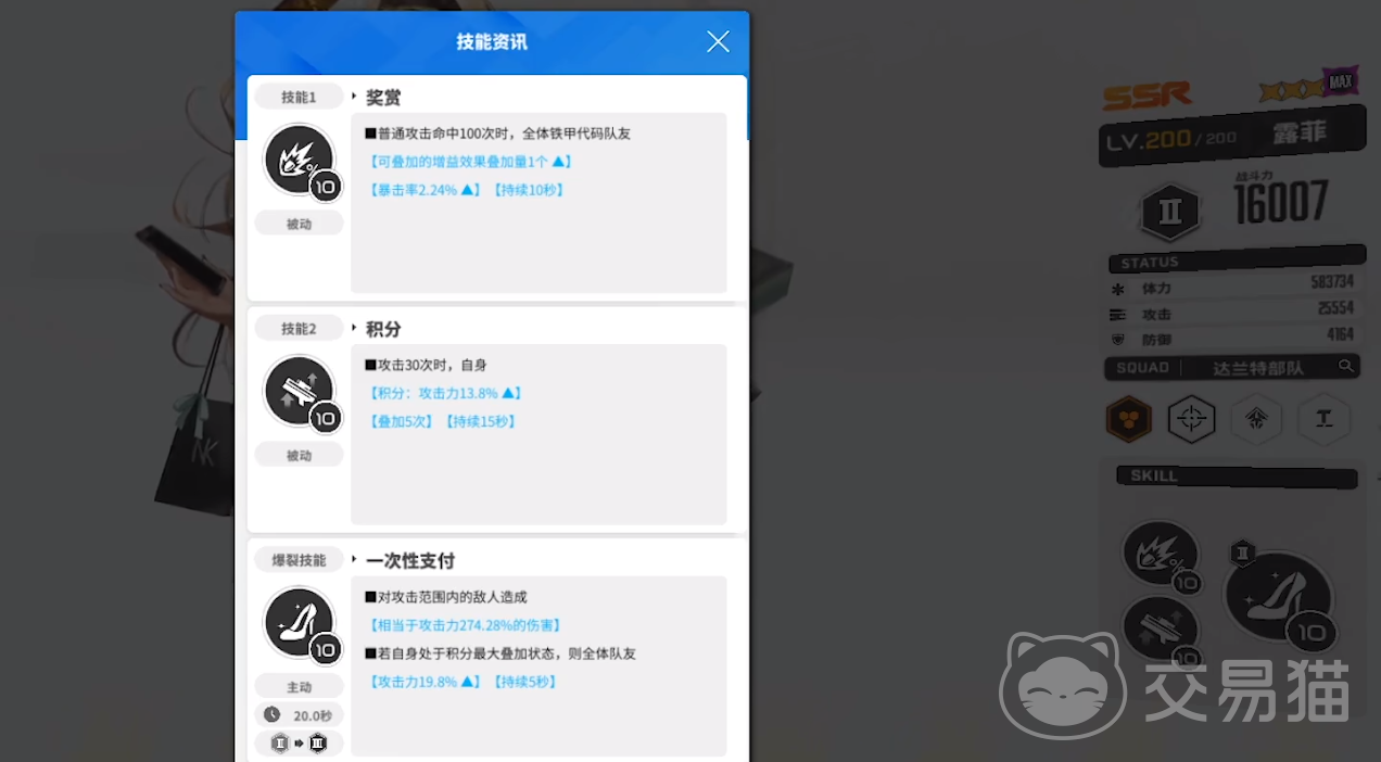 “一次性支付”为主动技能,冷却时间20秒。技能释放后,可对攻击范围内所有敌人造成相当于攻击力274.28%的伤害,瞬间打出高额爆发。若此时露菲自身处于技能2积分最大叠加状态,还能为全体队友提供攻击力提升19.8%的增益效果,持续5秒。这一技能在团队需要爆发输出或应对高难关卡时,能起到最大化团队输出作用。