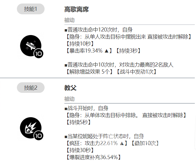 技能2叫做教父,战斗开始后隐身5秒,并提升最大装弹数3发(持续10秒);队友阵亡时,自身攻击力提升12.83%(可叠加10次),并补充爆裂进度20.54%。技能3叫做复仇,用了后可以对2名火力型敌人造成720.72%攻击力的伤害,隐身状态下额外造成高额攻击伤害。
