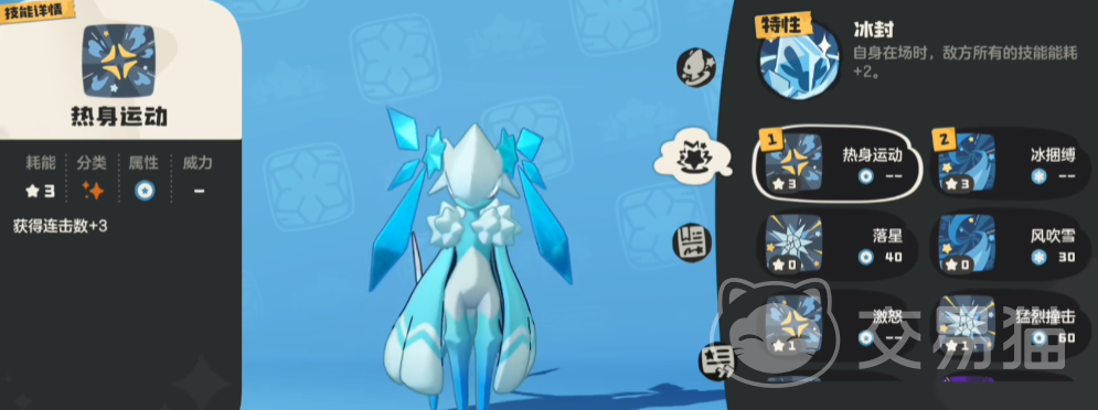 技能方面,其实不需要特别在意,只需要佩戴2个升级自带的技能就行了,分别是热身运动和冰捆缚。因为并不需要雪灵打输出,单纯做一个辅助就行了,所以3、4槽位的技能就不学了。