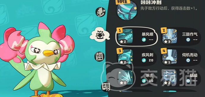 该精灵就技能搭配来看,需要搭配的技能一共有四个,这四个技能中第一个技能叫做暴风眼,这一个技能是一个状态技能,该技能可以提升连击次数,可以将原本的连击次数提升100%,这就是它所需要带的第一个技能了。