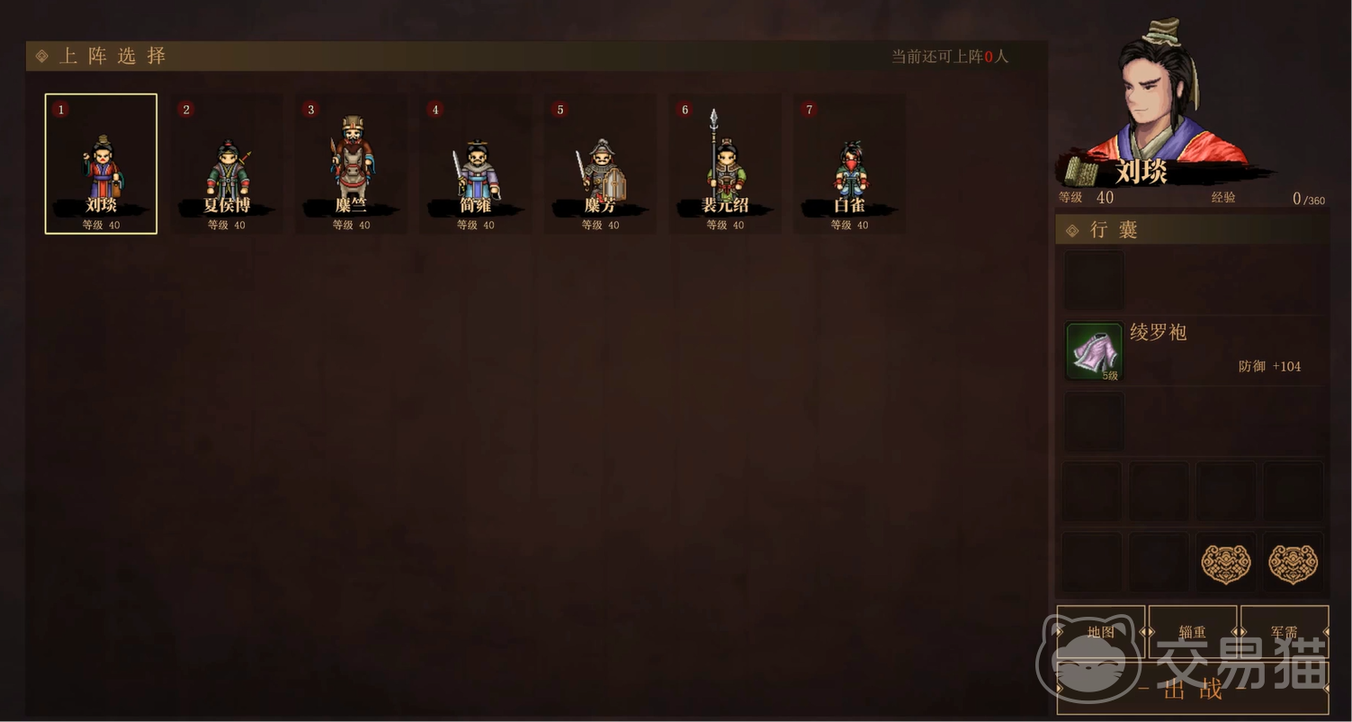 由于刘关张不适合出席这种战役,所以大家可以派遣刘琰+夏侯博+糜竺+简雍+糜芳+裴元绍+白雀的阵容组合,它们的整体实力很强悍,可以互相弥补。队伍等级平均在40级左右即可,然后尽量佩戴上极品装备,并用好每一招技能即可。