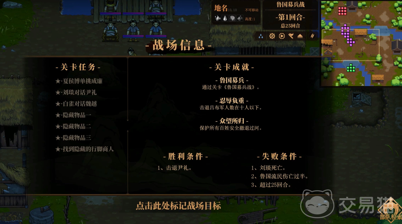 由于这些流民中有不少的刺头,所以大家就要击败它们,此人就是尹礼。另外领军的人也不能阵亡,然后流民也不能死亡超过一半,要在25回合内获胜。开局大家可以先用糜竺先攻,然后再用盾兵进行掩护,进攻的同时进行防御。
