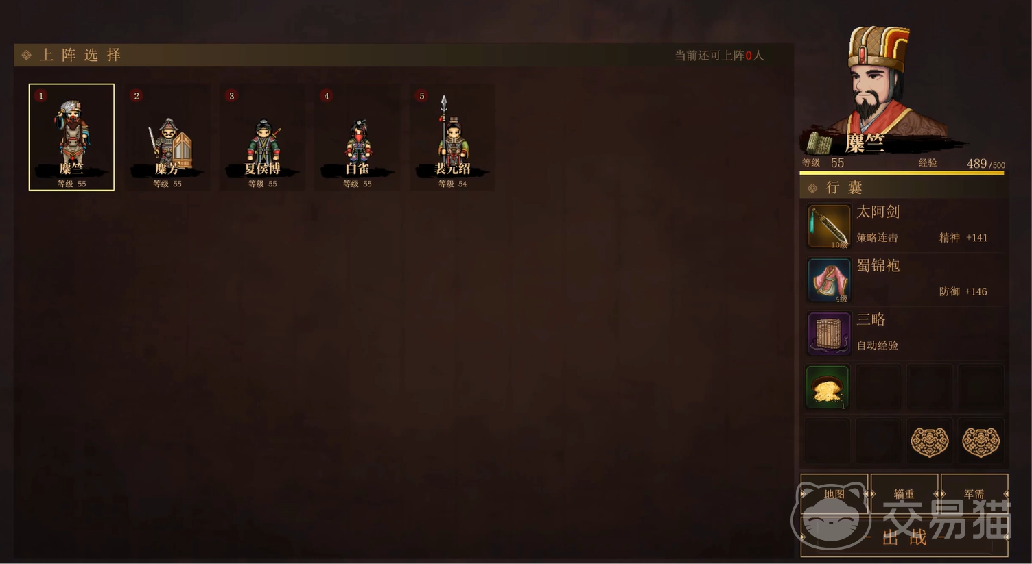 由于这个关卡中所限制可上阵的角色有限,所以更加推荐使用糜竺+糜芳+夏侯博+白雀+裴元绍,它们的综合实力都很强,并且可有效辅助或者进攻。不过角色数量少,所以每个角色都要培养好,例如佩戴高等级装备或者使用各种属性加成道具。