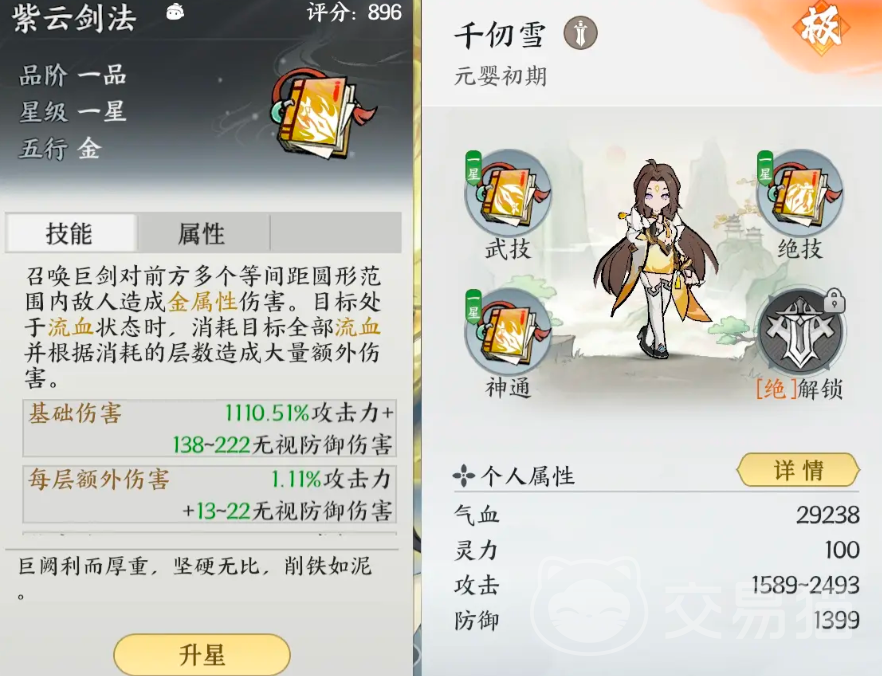 千仞雪的武技可以释放剑气,对前方的敌人打出金属性的伤害,一共可以打出三次伤害,她的绝技会把自身的灵气凝聚成剑气,随后向着四周发射,剑气会自动帮助选取目标造成金伤,并且每次伤害都会附带一个流血debuff,一旦受到该debuff影响,每秒都会被扣除1次气血,她的神通技会召唤出一把巨大的剑,随后对前方多个等距离圆形范围的目标造成金属性输出,若敌人们此时身处流血状态之中,还会消耗掉他们的流血,根据层数来额外造成大量额外输出。