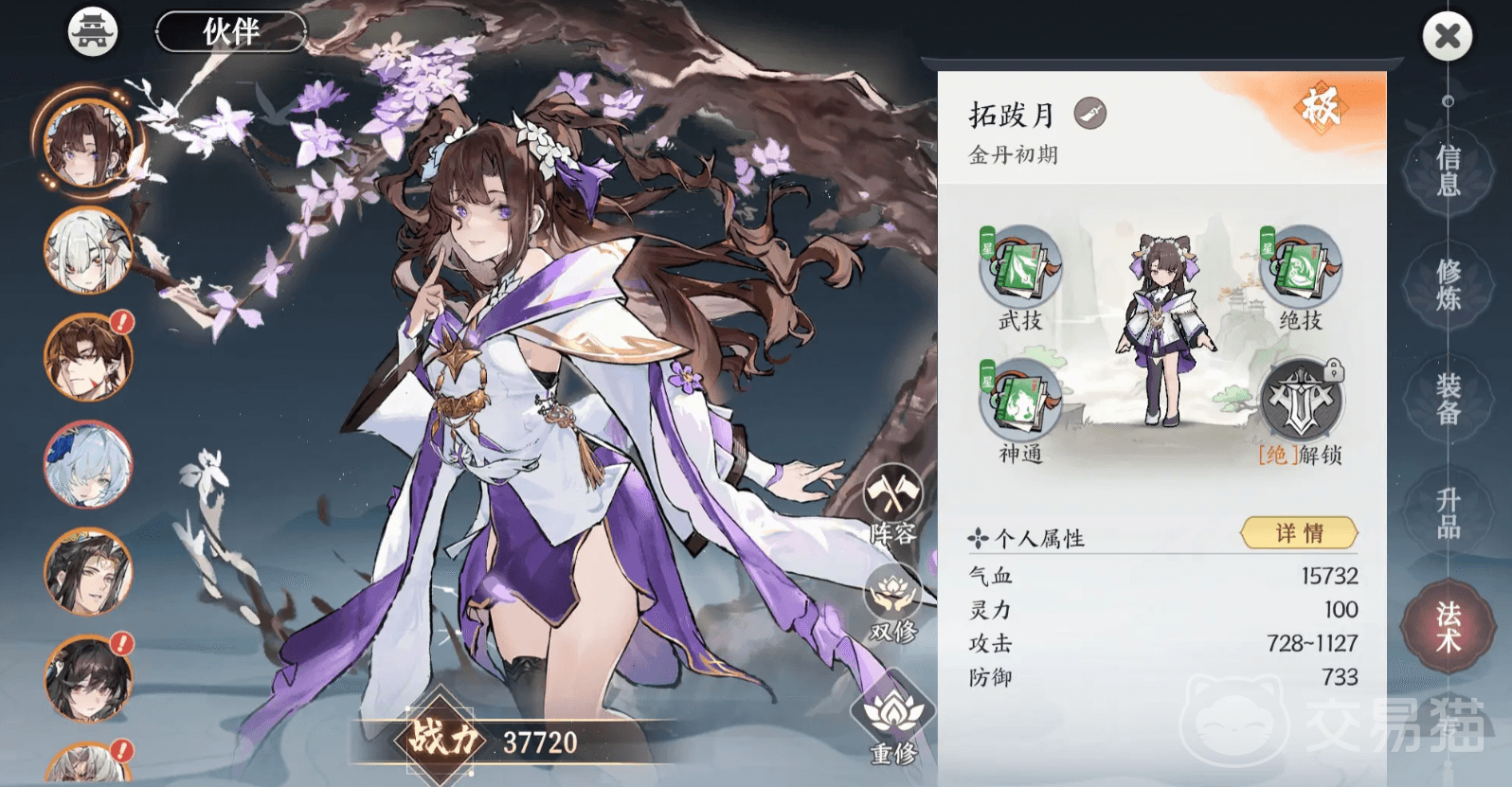 拓跋月是一位名副其实的大小姐,使用她不用担心蓝耗的问题,靠着消耗血量就能打出高额的输出,她的武技是对前方圆形范围造成单次木属性输出,她的绝技会牺牲自己的气血,召唤出巨刃持续对防卫内敌人造成大量木属性打击,并为自身添加洞察状态,当自己的生命低于一半时,巨刃会额外造成更多输出,处于洞察状态时,还会根据层数来提升每次攻击的伤害,需要注意这个提升无法对高处2个境界的角色产生效果,她的神通技会消耗掉一部分气血,召唤刀魔附体,让自身的攻击力大幅提升,并且生命越低攻击力越强,同时当武技使用的法术类型是刀时,还会降低其冷却时间。