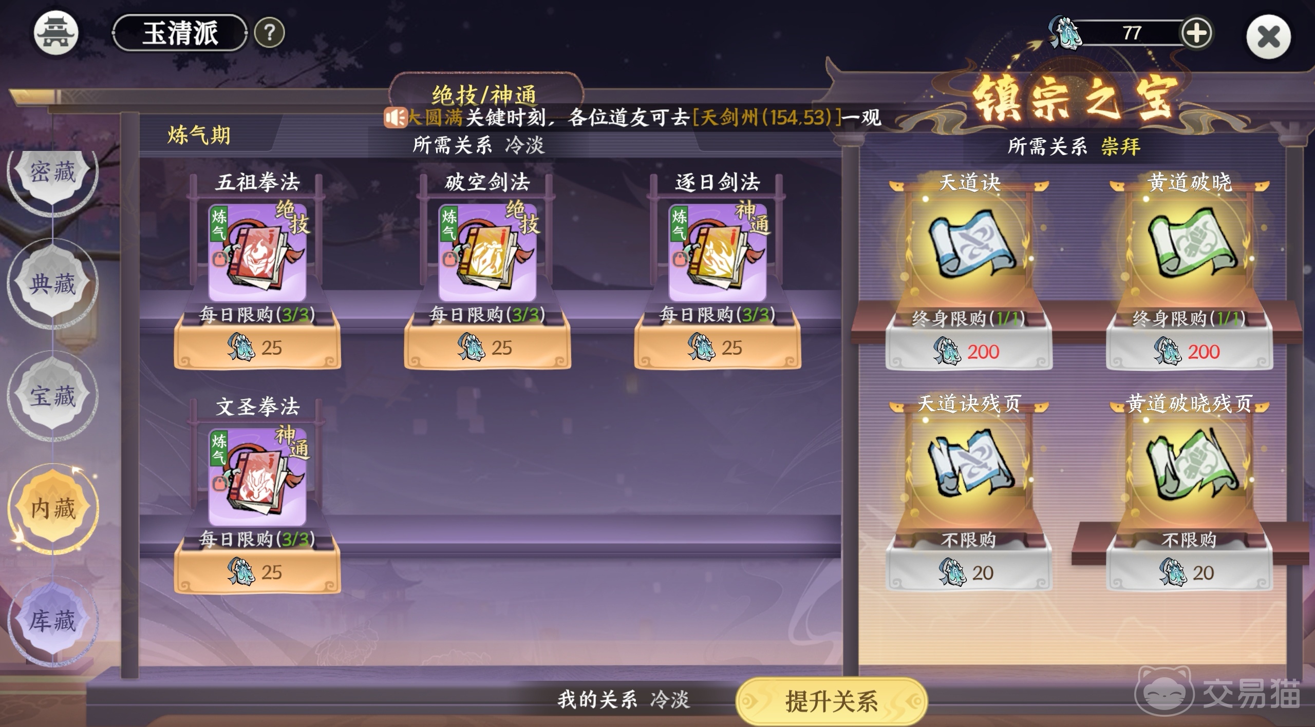 想要解锁之后的门派,除了自身的修炼境界要达到要求外,你还要亲自抵达对应的区域,找到门派所在的位置,进去后与门派的掌门过过招,就算是解锁这个门派了,后续想要提升和该门派的关系,就要都领取它们派发的任务,各个门派都会发出悬赏,你领取了悬赏任务并完成,不仅能得到一定数量的修为奖励,还能拉近彼此的关系,当关系到达崇拜等位置后,就有机会得到门派的镇派之宝,比如天道诀、黄道破晓。