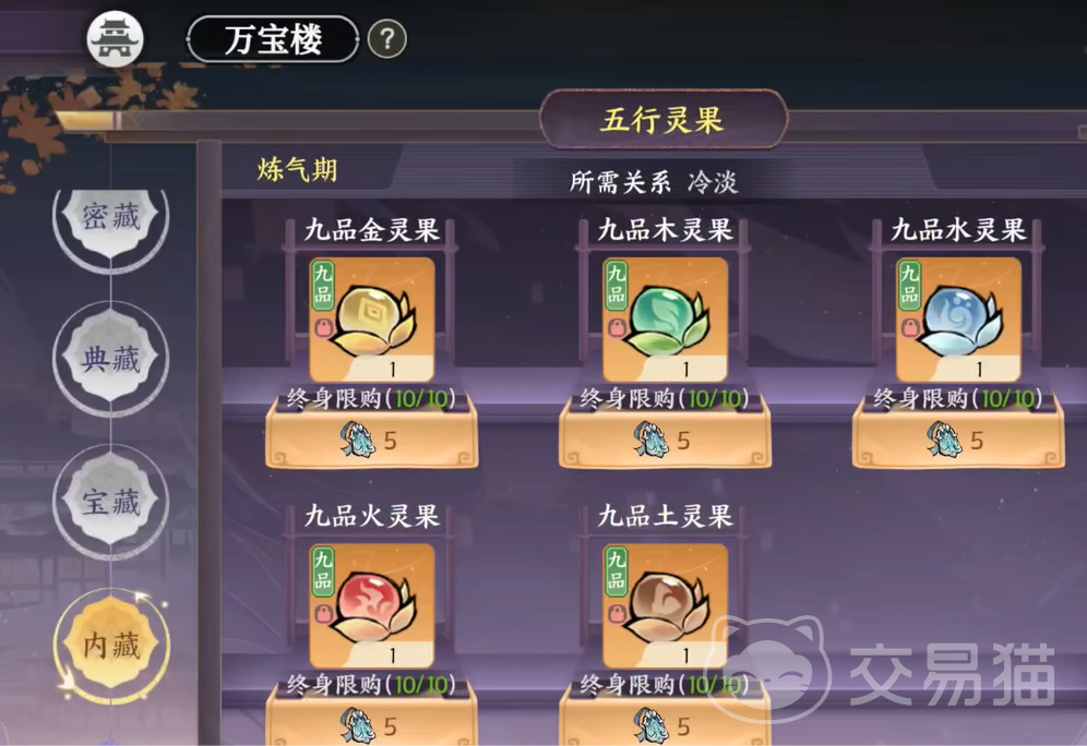 万宝楼中出售的物品很多,这里优先推荐大家购买的就是各种属性的灵果,分别是金木水火土。每一种九品灵果的限定购买次数是10,然后需要花费5枚令牌购买一个,当你将其全部购买之后。就可以大幅度提升自己的五行灵根的属性,从而加快自己的修炼速度。