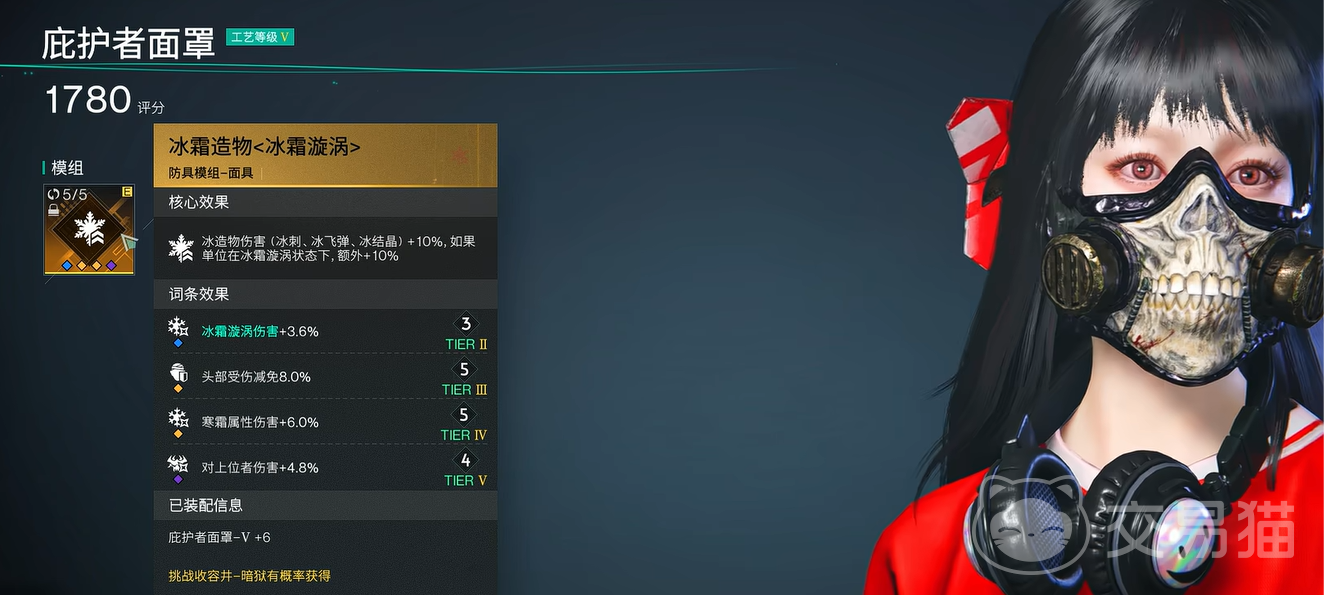 头部模组选择异常强化,可以增加10%的射速和20%的异常伤害加成,这时就可以将大家的射速提升至825。这已经是非常够用了,所以后面的图纸就不需要再带射速。面罩模组可以用冰霜造物,可以给冰晶飞弹增伤;如果敌方在冰霜漩涡里面,再额外加10%的伤害。