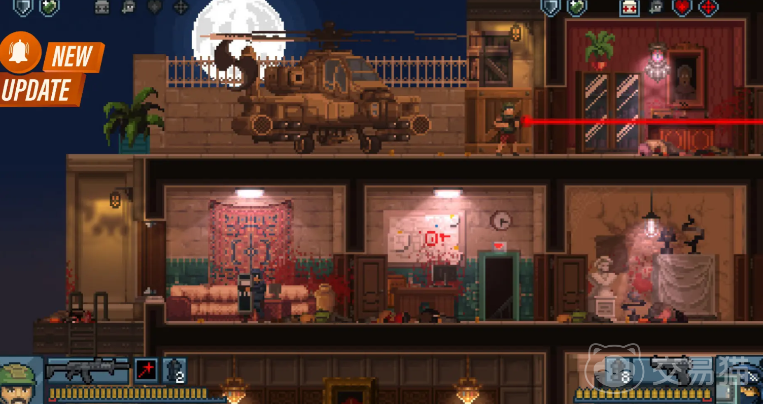 其次,它为玩家打造了独特的风格与玩法。它采用了高细节性的像素复古式图形,这种独特的画面风格为玩家带来了一种怀旧而又不失现代感的游戏体验。游戏将策略战术与横版动作射击完美结合,玩家需要精确规划破门时机、队员走位、投掷角度,甚至每颗子弹的弹道,这种深度的策略性使得游戏更具挑战性和可玩性。