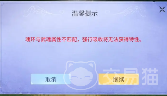 新手在达到10、20这种整数等级后,就会自动开启猎取魂环的任务,必须要大家拿到新魂环才能提升等级,这时我们可以点击“查看魂兽”跳转到地图页,在其中找到紫色的范围前往,抵达后先用“紫极魔瞳”来扫描这个区域,找到符合自己角色属性的魂兽,比方说如果是白虎武魂就适合圣属性的,然后将其击败就可以进行吸收了,吸收的时候需要注意若是不和自身特性的魂环,会有下图中无法获得特性的情况发生,如果出现大家记得在宗门商店获取魂性回溯道具,来添加想要的特性;