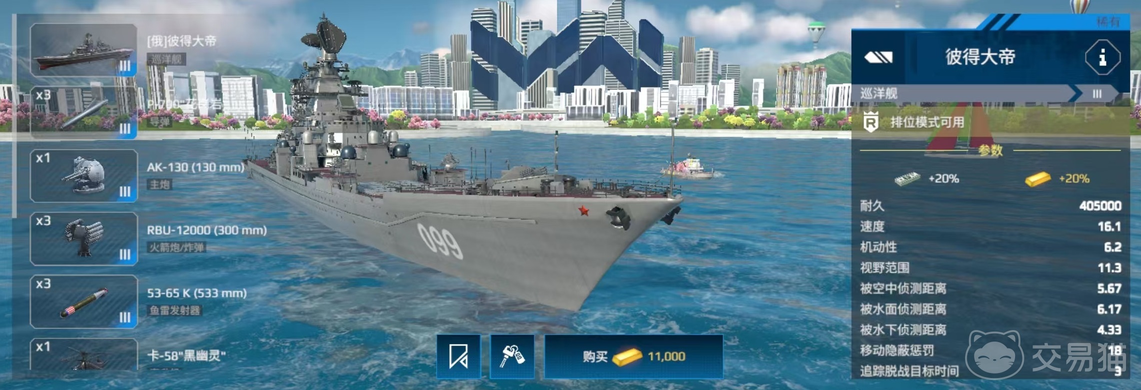 第2艘是彼得大帝巡洋舰,这艘舰船血量高,武器全面,反潜能力是游戏中非常出色的一款,在操作时要注意保持中距离,优先集火对方的脆皮驱逐舰。如果遇到对方潜艇要切火箭炮预判进行攻击。武器可选性比较多,无论是导弹还是主炮、鱼雷,都可以更换为更强悍的类型,这样就有了很大的提升空间,也可以玩出自己的个性。