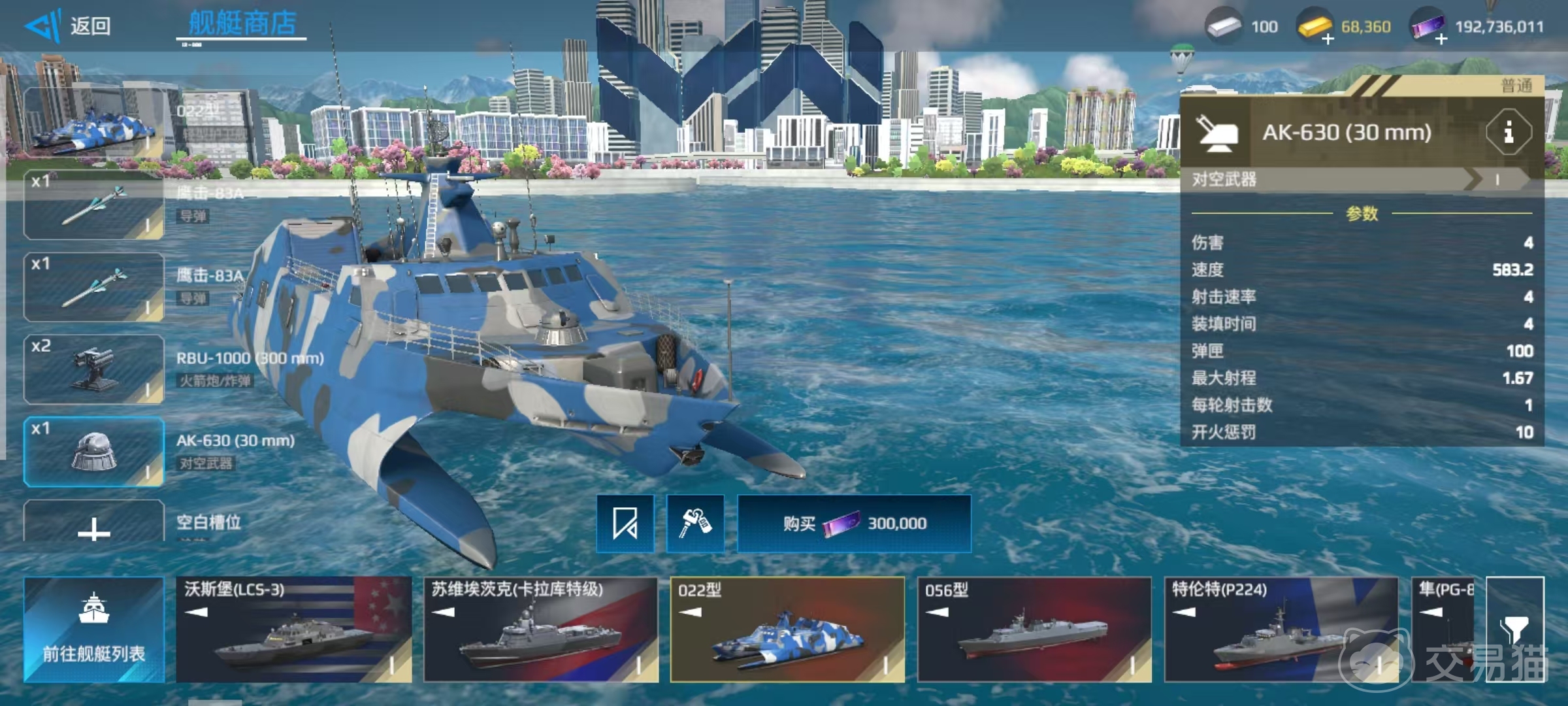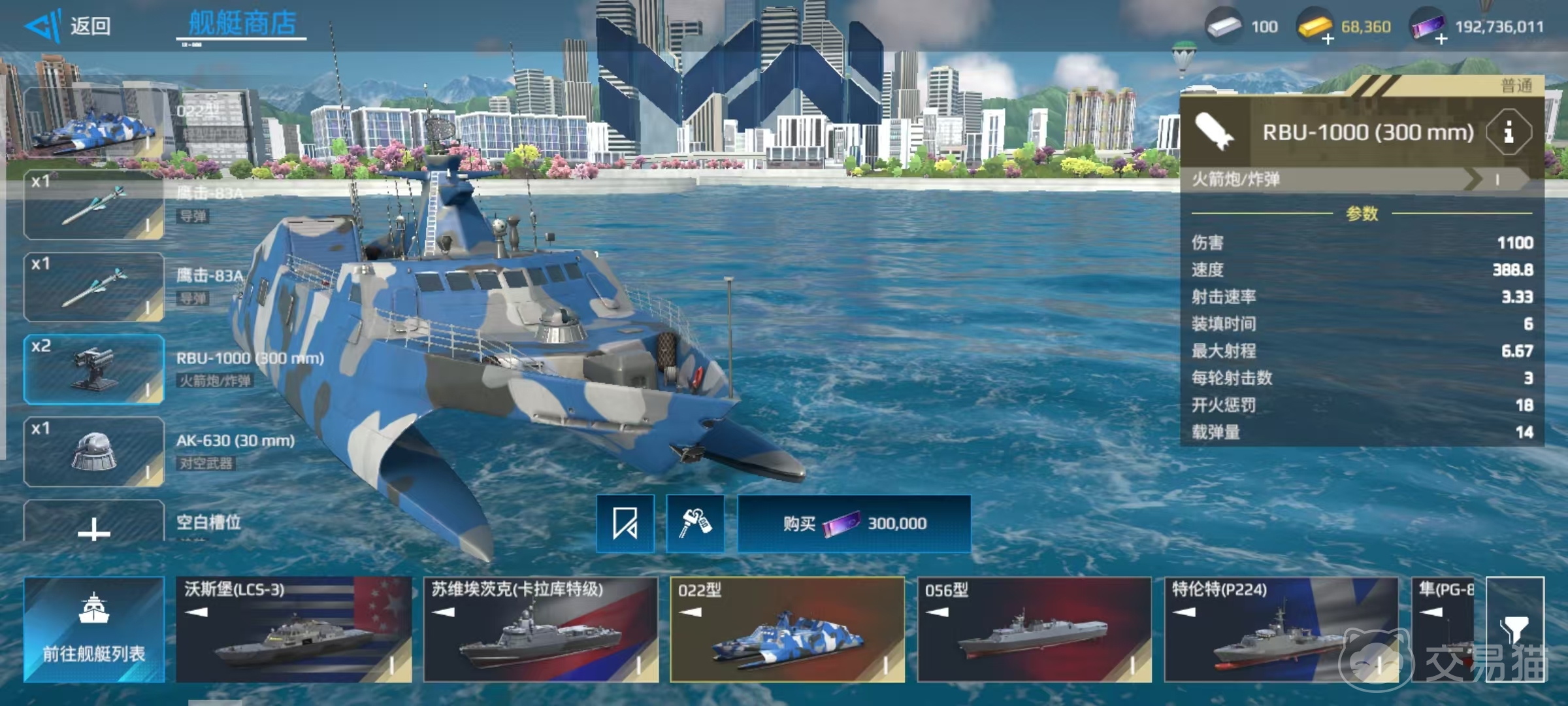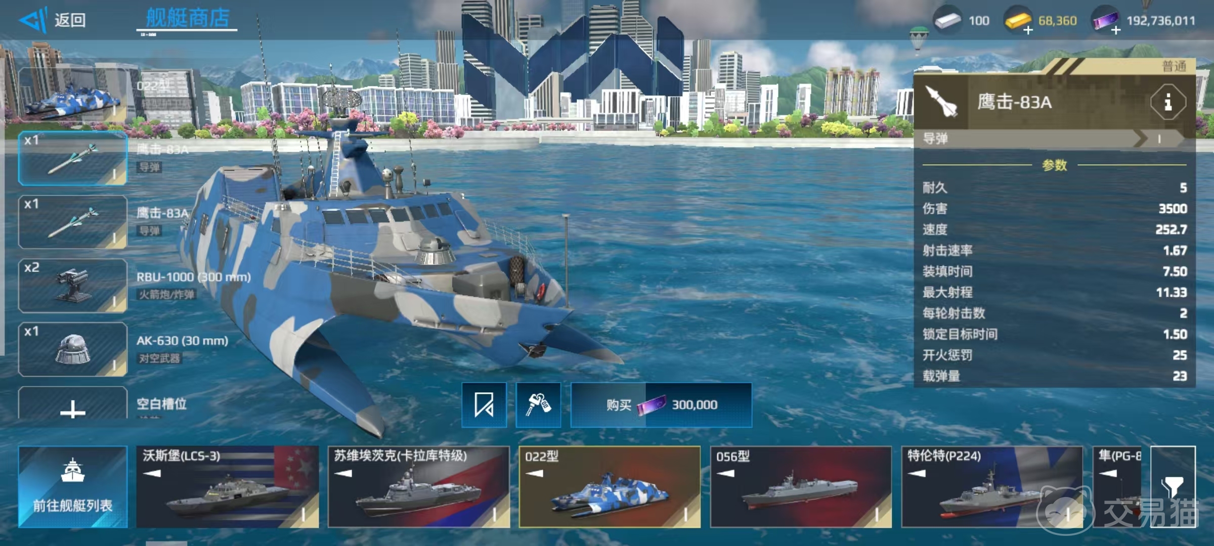 022还有着一定程度的隐身能力,可以使用的消耗品包括修理包、干扰弹和弹药储备,装备的武器包括2枚导弹、2枚火箭炮或炸弹以及一挺对空武器。022所携带的武器都不是锁定的,不过初始携带的鹰击-83A导弹就已经非常出色。这款导弹拥有3500伤害和11.33的最大射程,在当前房间中战斗已经足够使用了。当然如果大家想要继续强化,也是有着一定的改装空间。