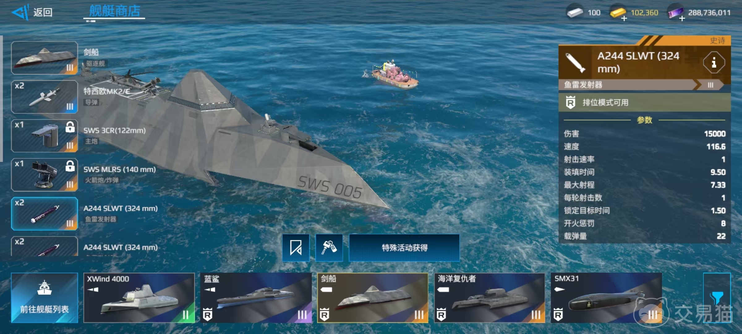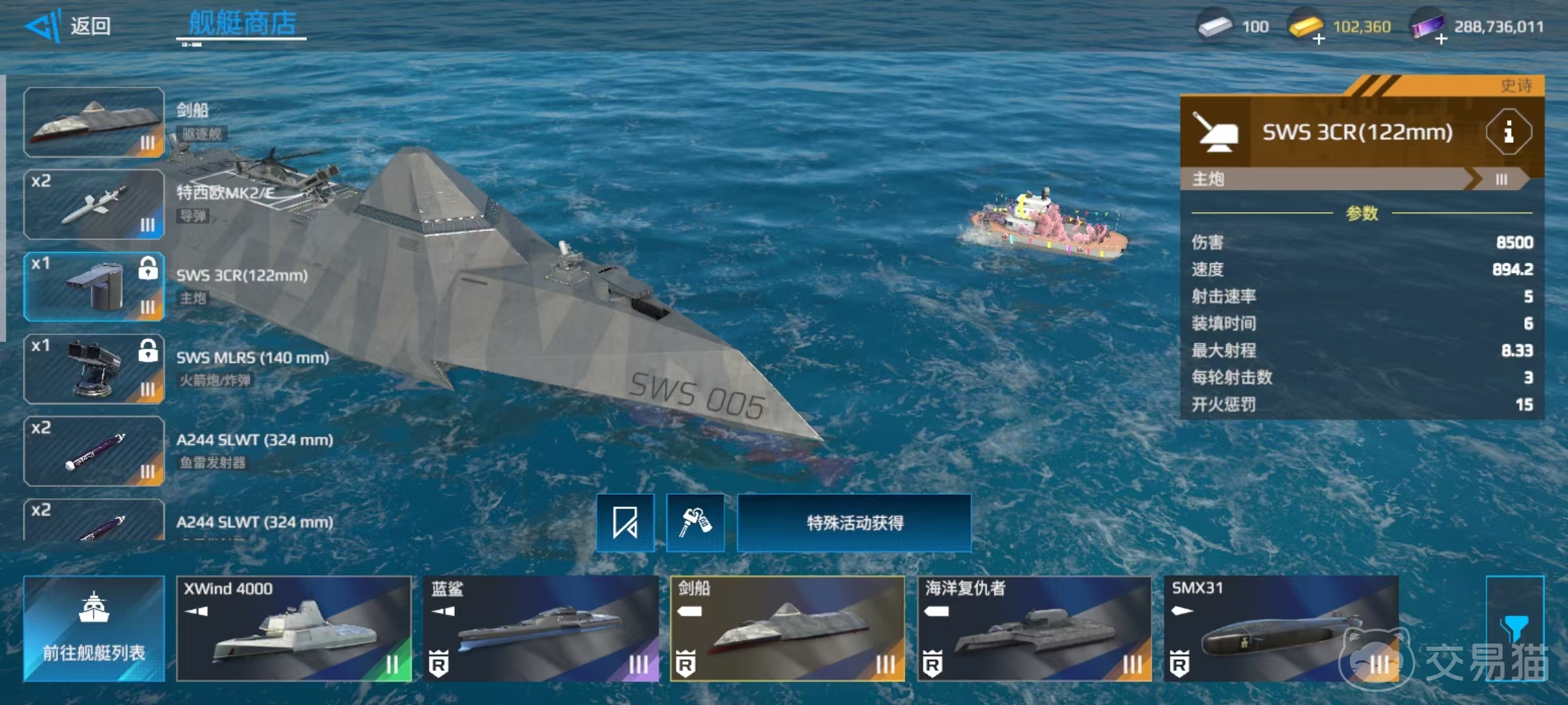 本身所携带的武器就已经非常优秀了,例如装备的SWS3CE122毫米口径主炮,拥有8500的单发伤害,一轮发射3发,还有SWSMLRS140毫米口径的火箭炮和A224SLWT324毫米鱼雷发射器等。在实战中可以凭借自身的主炮和鱼雷形成短程高伤害组合,在经中近距离战斗中可以发挥出强大威力。再凭借好自身的速度和机动性优势,快速突破对方的防御,直接到达身旁进行一轮齐射,可以出其不意的重创目标。