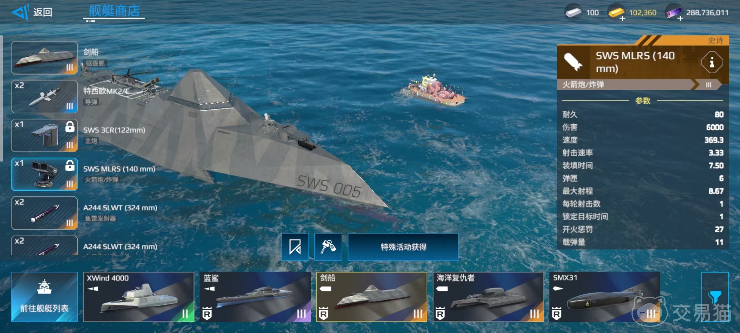在不进行升级的前提下,初始属性方面,剑船就有335000的耐久,24.3节的速度以及8点机动性。其余方面,视野范围8.7,空中被侦测距离3.94,水面被侦测距离4.43,水下被侦测距离2.63,隐身1.5。装备的武器包括两座导弹,一座主炮,四驱鱼雷发射器,一座火箭炮,两座对空武器和一架直升机。