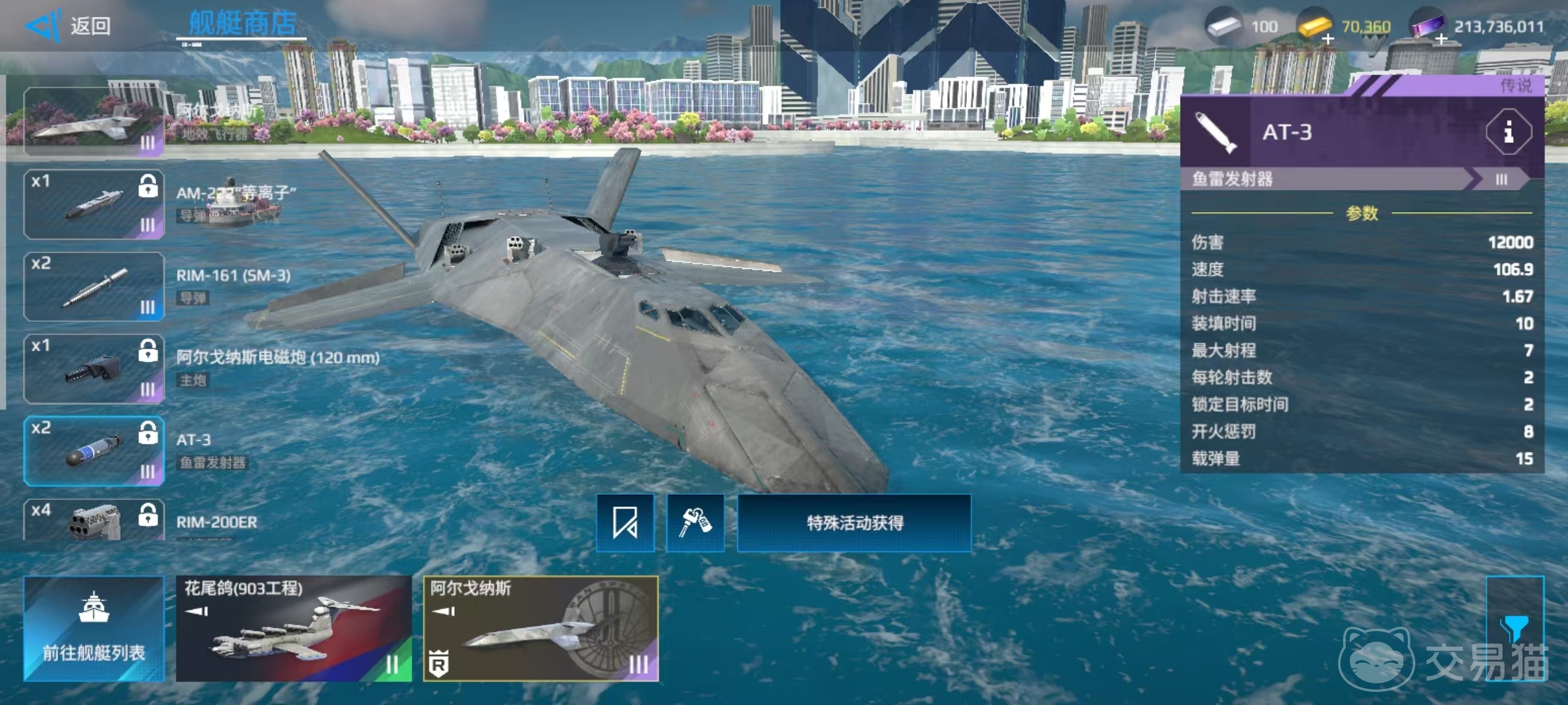从阿尔戈纳斯这艘舰船的外形方面就可以看出,它绝对是一款概念型的船只,是来自于实验性的攻击型地效飞行器,目的就是为了快速向水面和沿海地面部队提供支援火力。在属性方面,初始的情况下耐久为315000,速度44.7,机动性9.5,视野范围7.3,另外还具有很好的隐身性。这样的数据在一众三级船中都是非常抢眼的。消耗品方面和常规舰船比较相似,是修理包、干扰弹、弹药储备和电子对抗的组合。