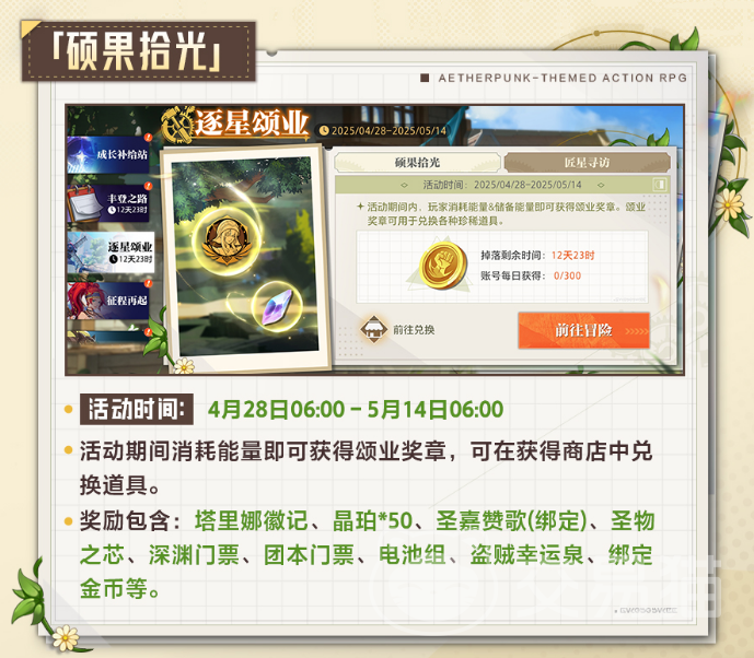 “硕果拾光”活动则是一个奖励集锦!只要你在活动期间消耗能量,就能获得颂业奖章,而这些奖章能在专门的兑换商店里换取各种珍贵道具。塔里娜徽记、深渊门票、团本门票、电池组等一应俱全。对喜欢打团本、刷副本的玩家来说,这个活动简直是提升战力的必备良机,绝对不能错过。