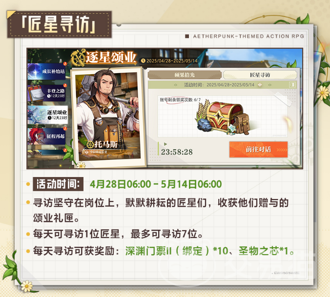 如果你还想尝试一下与其他玩家的互动,那就来试试“匠星寻访”。每天可以前往寻访匠星,收获他们赠送的颂业礼匣。每一位匠星都藏有丰富的奖励,像深渊门票、圣物之芯等,只要完成寻访任务,就能轻松获得这些奖励。每天最多可以寻访7位匠星,每位匠星都能给你带来意外的惊喜。