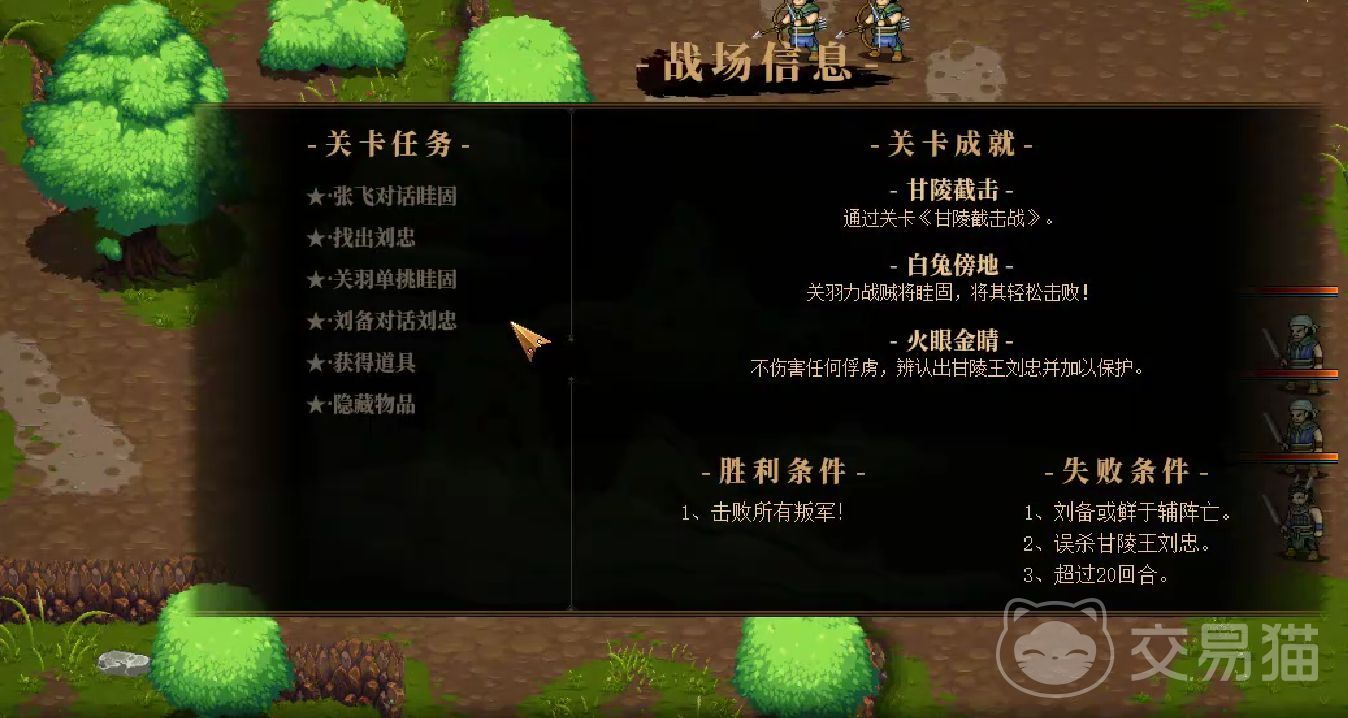 在游戏中,甘陵截击战中,除了要寻找刘忠,还需要张飞对话睦固,刘备对话刘忠以及关羽单挑睦固等等任务,这些任务是一连串的,玩家需要及时的完成,这样能够有效地推动整个游戏剧情的发展,也让游戏变得更加有意思。当然玩家在体验该游戏时能够了解这些历史人物的性格跟背景。