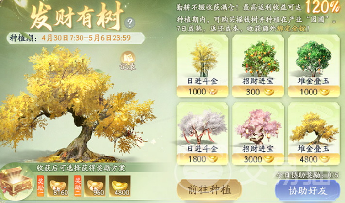 而另一项有趣的活动——“发财有树”,将从4月30日持续到5月13日。活动期间,玩家们可以购买摇钱树种子进行栽培。这不仅仅是简单的种植,摇钱树长大后,还能为你带来绑定金锭,堪称一项稳赚不赔的活动。特别的是,每日给摇钱树浇水、除草等护理工作都会提升树木的养护值,树木养护达到一定标准后,最终的奖励会更加丰厚。这项活动的互动性强,让人不禁期待最后结出的“金果”!
