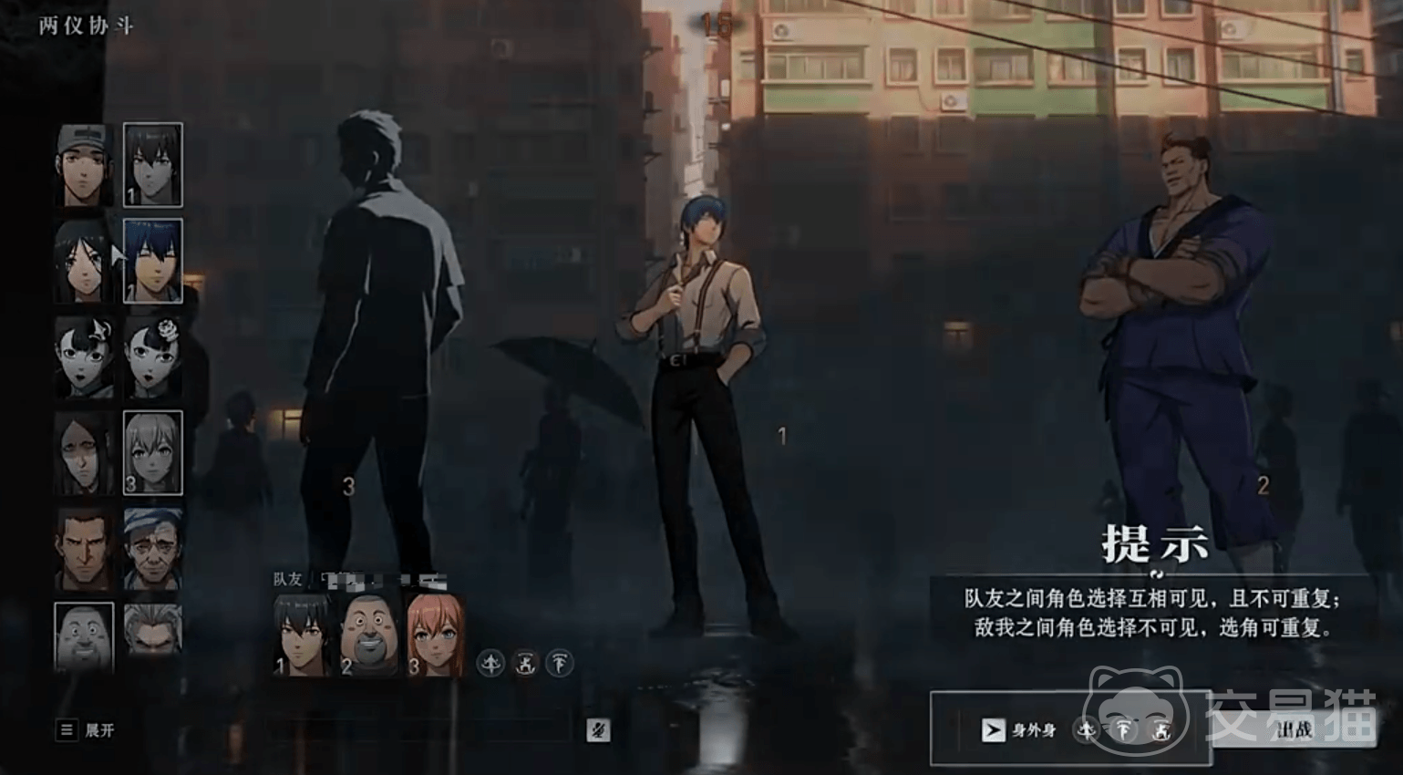 在两仪协斗中,玩家可以和自己的好友组成双人小队,敌我双方四人同时进入到战场中,进行同屏的2v2对战,在点击两仪协斗进入玩法后,玩家将会先进入到选人界面,在选人环节每名玩家都可以自由选择3名角色以及最多3个身外身技能。