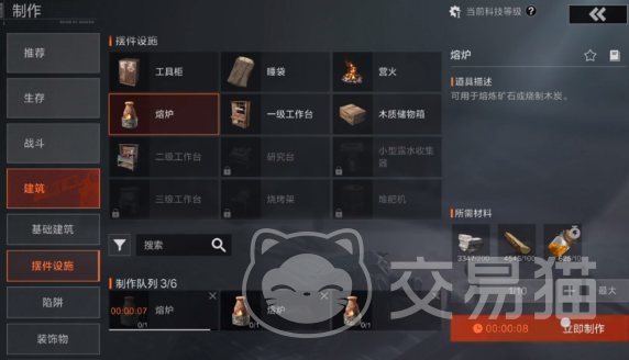 玩家需要注重基础的制作,可以进入到制作的界面找到熔炉,这是一个关键道具。游戏中有很多的材料,例如硫磺,还有木炭都需要通过熔炉去加工,这也是提升装备的一大关键支出。