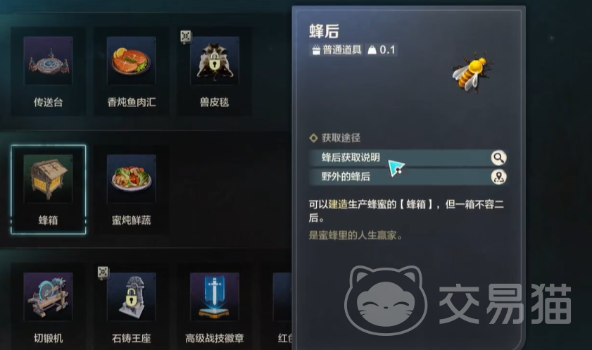而养殖蜜蜂的方法很简单,玩家们需要去制造想将蜜蜂巢穴打造出来,之后玩家将之前收集的蜂后放在里面,这时候就可以定期产出蜜蜂,这个蜂巢的打造数量只需要1-2个就够了,因为蜂蜜的需求量不是很高,只需要少量的设备就能维持基地的基本需求了。
