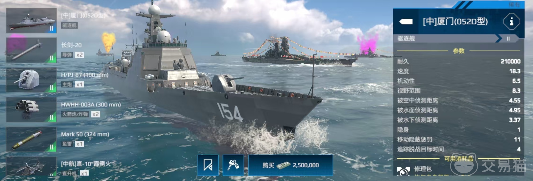 在现代战舰中,052d又被称为厦门号,是一艘二级驱逐舰,在二级房的战斗中也是经常会出现的角色。先来看一下基础的属性,在没有升级强化的状态下,耐久为21000,速度18.3节,机动性6.5,视野范围8.3。当后续进行升级时,耐久可以最高达到273000,速度能够提升至23.8节,机动性能到8.5,视野范围最高10。武器配置方面,拥有两座导弹,一具鱼雷发射器,一座主炮,两具火箭炮,两座防空和一架直升机。