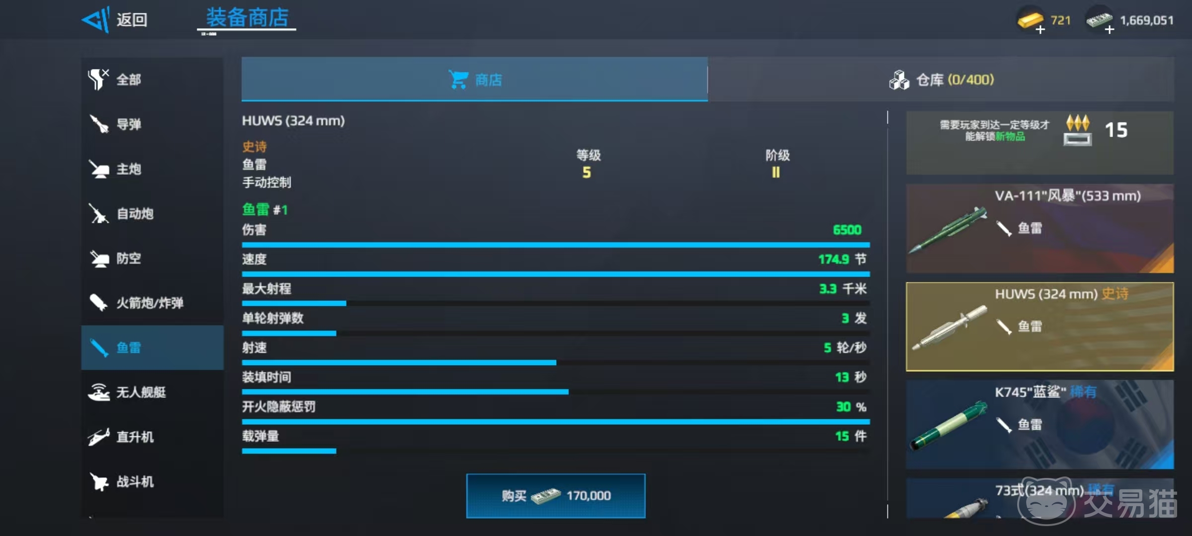 鱼雷方面也要慎重进行选择,小编比较推荐的是HUWS 340毫米口径鱼雷,这枚鱼雷的伤害为6500,速度174.9节,最大射程3.3千米,接近对方之后一发直接入魂。防空方面全部改成风暴,风暴的特点就是速度非常快,可以更好地进行拦截。最后是在舰载机方面,为了继续强化防空,选择wg34,这样在防空方面就非常出色了,避免了防空方面拖累整场战斗。