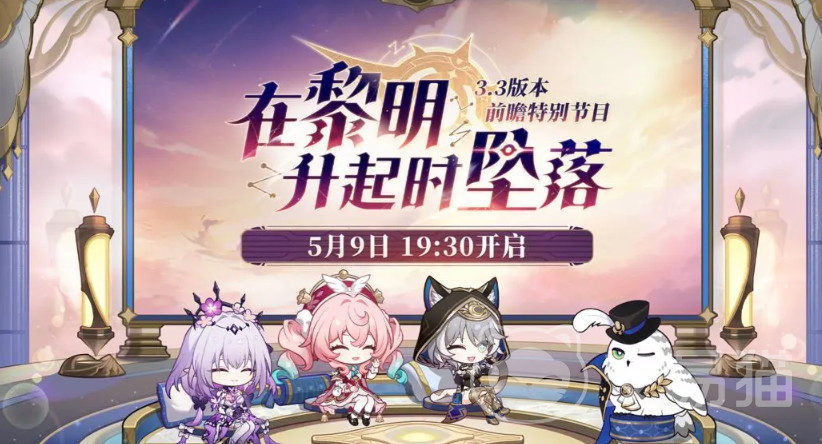 这次3.3版本的前瞻直播主题是“在黎明升起时坠落”,将于5月9日晚上7点半开启,届时会有更为详细的关于3.3版本要出的新角色、卡池信息、限时活动等等内容,大家可以提前定个闹钟。