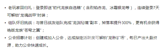 此外还有老玩家回归礼,以及组队怀旧挑战礼,玩家在登录之后就可以获得初代龙族自选箱,里面有冰霜银龙,还有烈焰赤龙。如果连续登录7天,还可以解锁龙魂战甲时装。和之前的老玩家一起组合成队伍完成能源秘境副本掉落率可以提升300%,能有机会获得苍穹之翼。