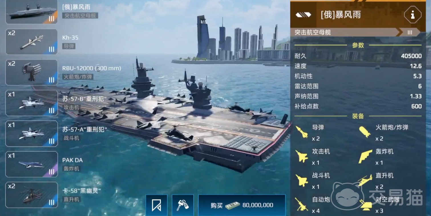 作为突击型航母,暴风雨在游戏里的售价高达八千万游戏货币(仅航母),价格还是比较贵的,但它能搭载战斗机、攻击机、轰炸机、导弹,自身还拥有防空炮、火箭炮等,整体的参数也比较不错,所以在性能上可谓相当的优秀,同时也是一艘在各方面都比较全面的航母。