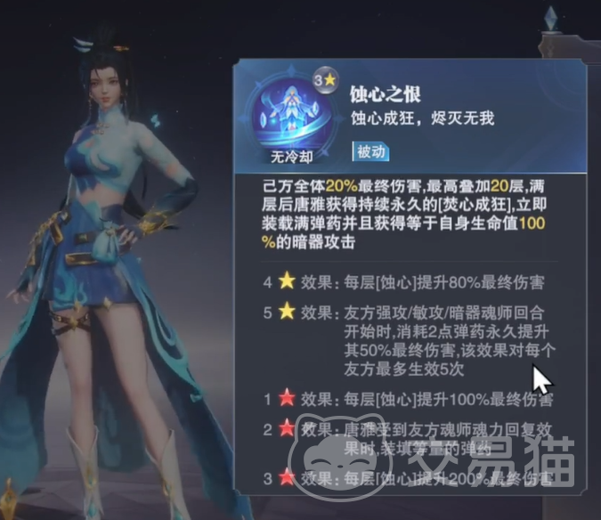 你可能会想,这样的增伤效果一定是非常依赖她的星级。猜测是对的。唐雅的效果随着星级的提升而变得更加可怕。黄4星时,她每积累一层“蚀心”,友方的最终伤害就提升80%,这个提升幅度可不是一般的魂师能比的。而到了黄5星,她不仅能在强攻、敏攻、暗器回合为队友增伤40%,甚至还能在每回合增加敌方伤害的同时大幅提升队伍的整体输出。