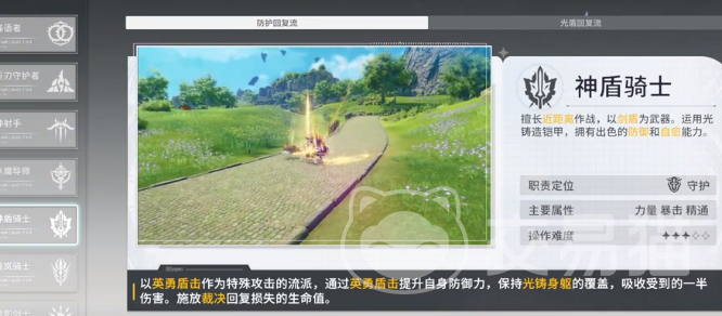 神盾骑士:是一个能扛能奶的角色,二次转职也会具备防御回复以及光盾回复流。具备普攻三段第1个技能盾击加上防御,第2个技能可以回血,相对来说是比较全能。