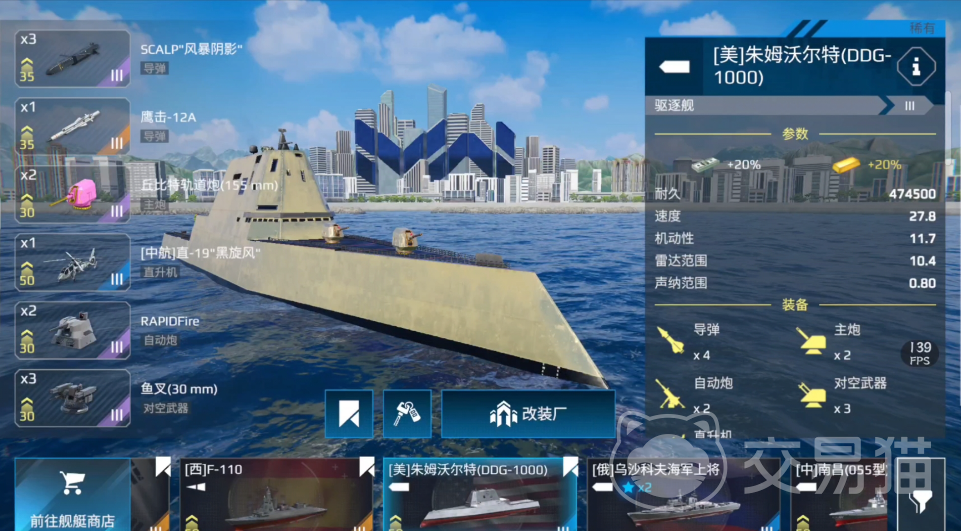 小编第1个给大家推荐的战舰是朱姆沃尔特。这艘战舰最大的优点就是侦察力和反载力都非常的强,机动性达到了27.8,雷达范围则是达到了10.4。因此小伙伴们在战斗时,可以利用它出色的移动能力,和通过雷达所收集到的信息,打敌人一个措手不及。在装备这方面也算是比较全面,主炮、自动炮、对空武器和导弹都配置到了,不过也不能看出,在反潜这方面会有些薄弱。