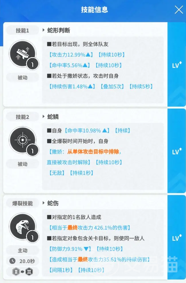 一技能评价:毒蛇的一技能加成不错,不过每场战斗中只会触发一次,像特殊拦截等B0SS战里只会在开局触发10秒,之后就算是转阶段也无法重复触发,一技能覆盖率不够高的问题让毒蛇的实用性降低不少。