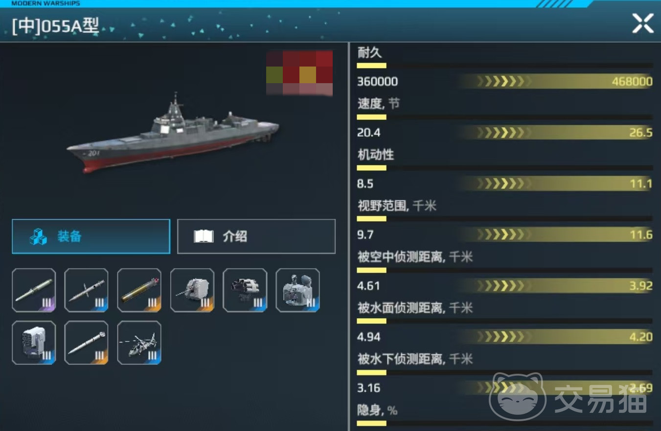 先来看一下055a的基础属性,如果能够提升到满级状态,那么耐久为468000,速度26.5节,机动性11.1,视野范围11.6千米,被空中侦测距离3.92千米,被水面侦测距离4.20千米,被水下侦测距离2.69千米,隐身能力为5%。所携带的武器包括四座导弹,三具鱼雷发射器,一座主炮,两具火箭炮,七座防空和一架直升机。