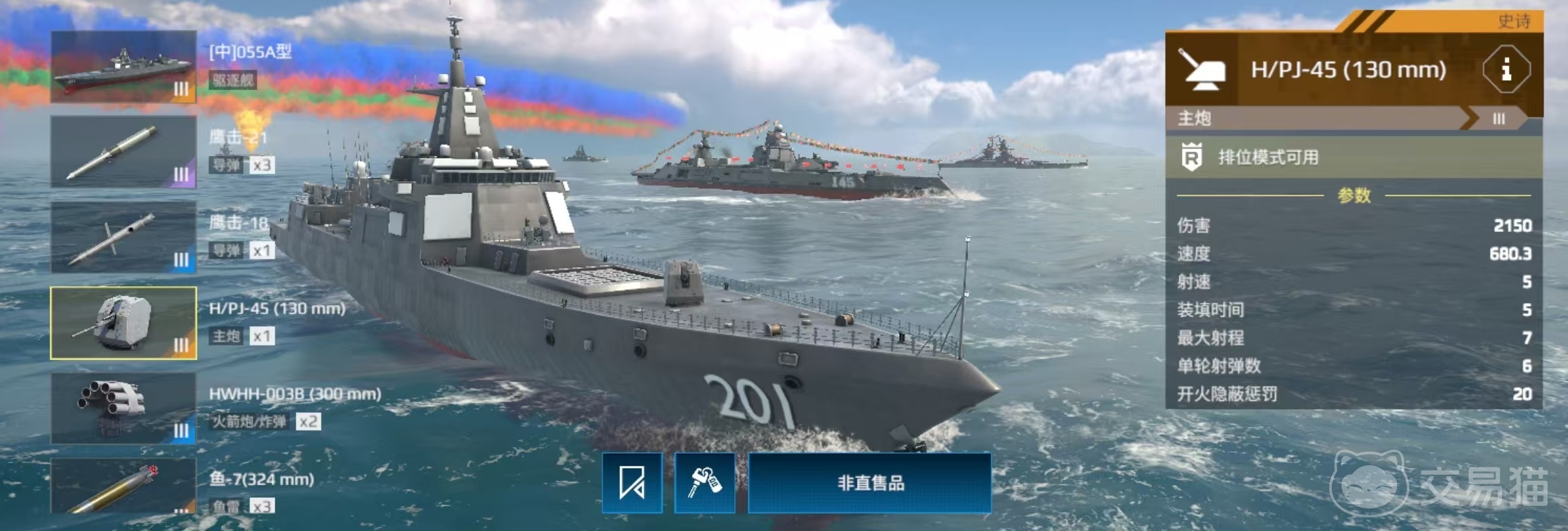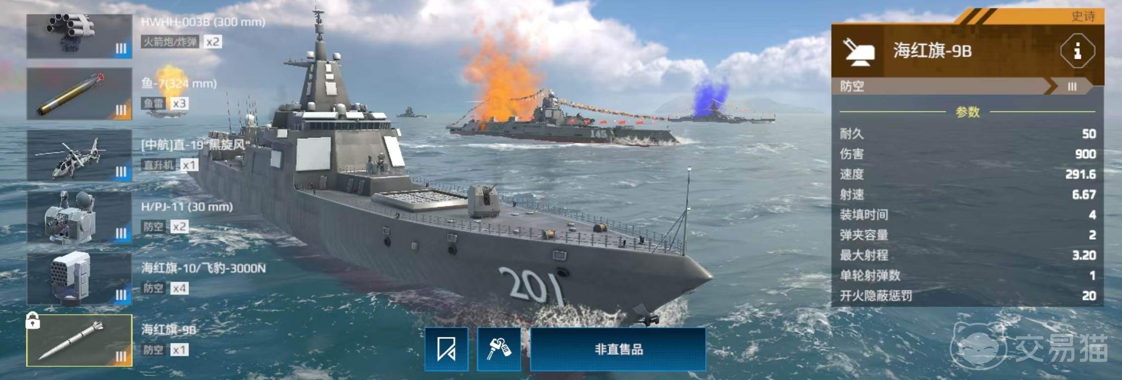 在这些武器中,只有防空导弹有一个槽位是锁定的海红旗-9B,其他都是可以进行更换的。 在导弹系统方面,推荐选择鹰击12A和海科导弹。鹰击12A具有伤害输出高,可同时发射两枚的特点,无论是速度还是攻击范围都很优秀。海科导弹的弹道非常独特,可以突破对方的防空系统。反潜装备方面推荐选择精度和伤害都很高的黑鲨鱼雷,锁定速度快,是现在反潜战的有效武器。火箭炮方面可以选择726-4A型,其他可以根据自己的实际需求和经济条件去进行搭配。