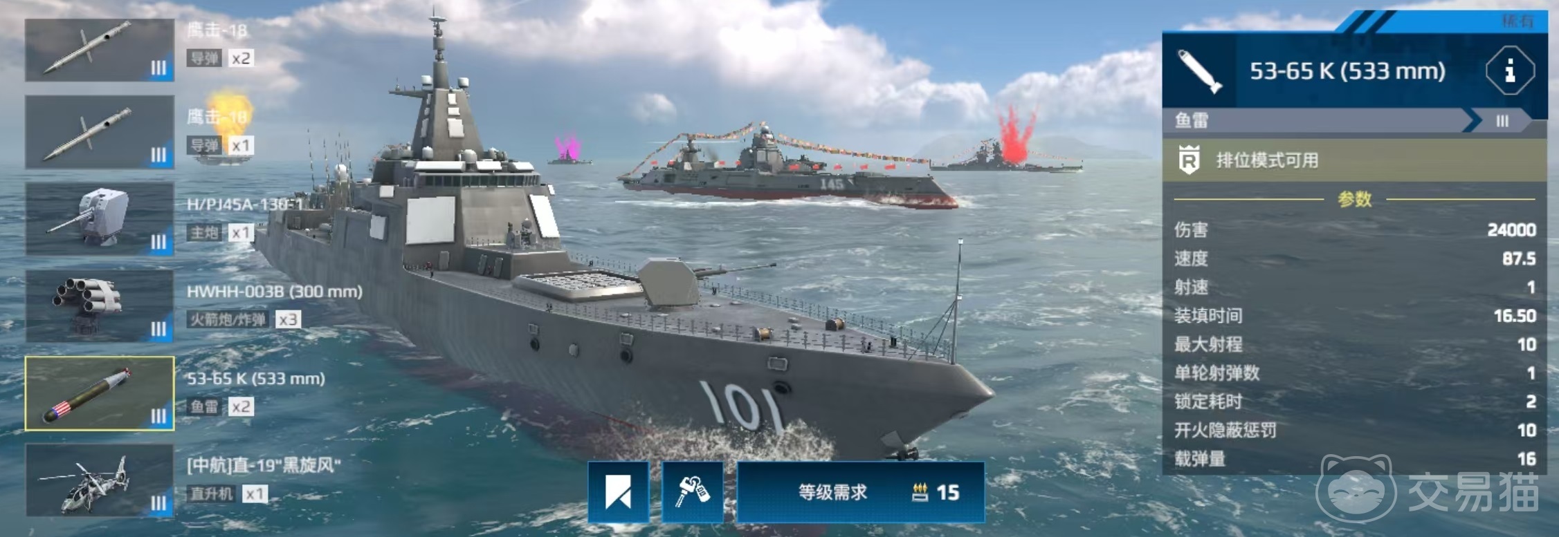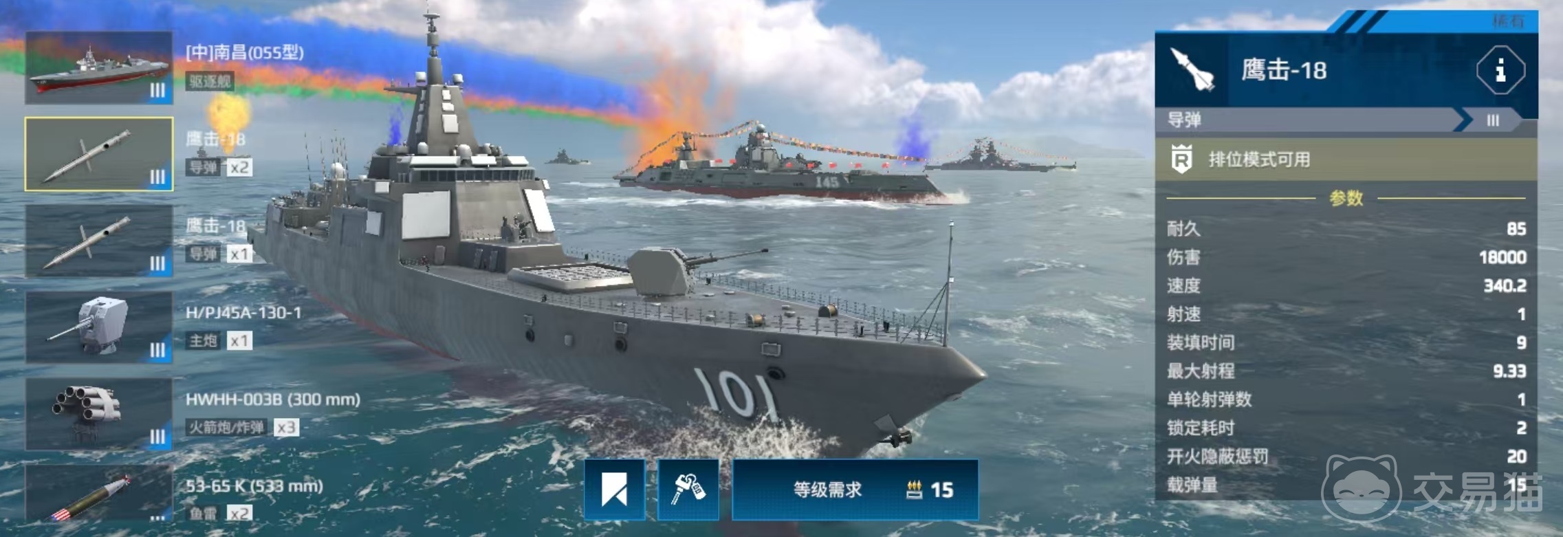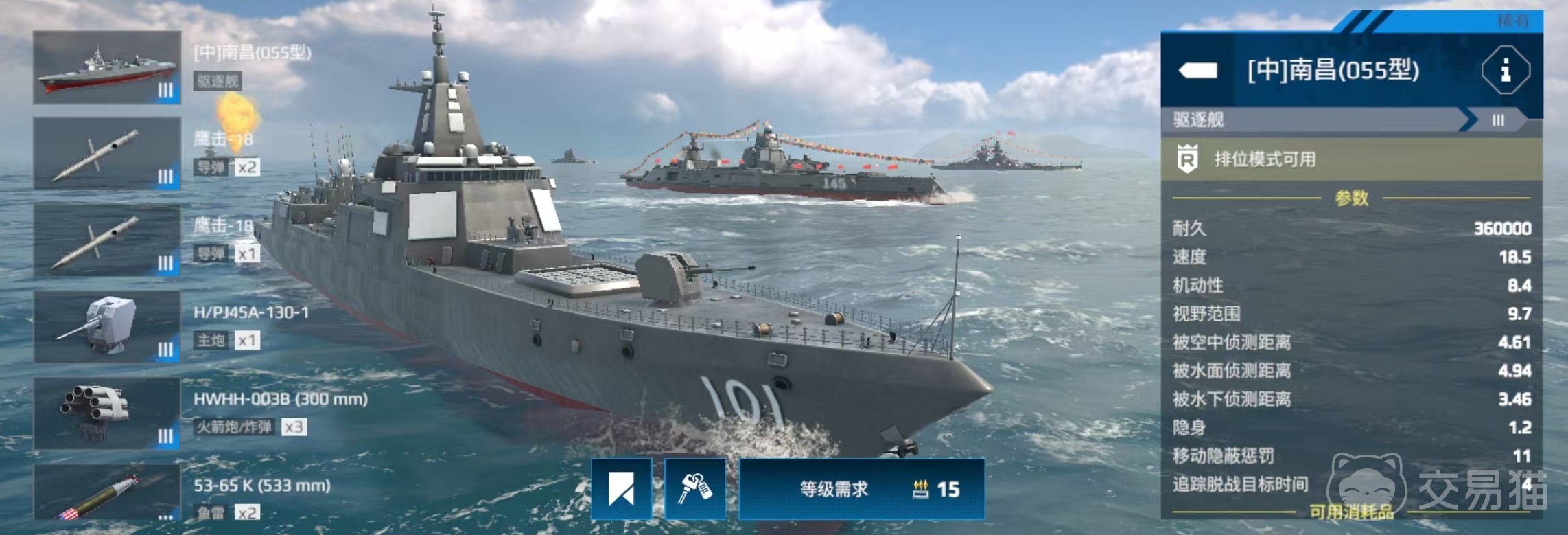 大家要注意,这里所说的指的是游戏中的055型南昌舰,并非是另一艘055a型,所以大家要搞清楚。055是属于玩家等级达到15级才可以购买的,售价在1000万游戏币左右,要注意,这仅仅是购买舰船本身所需要的花费,后续如果要进行武器的更换,那么还需要花费更多的代价。055这艘船所有的武器都是可以进行更换的,这就意味着如果要达到最佳状态,还需要继续投入。